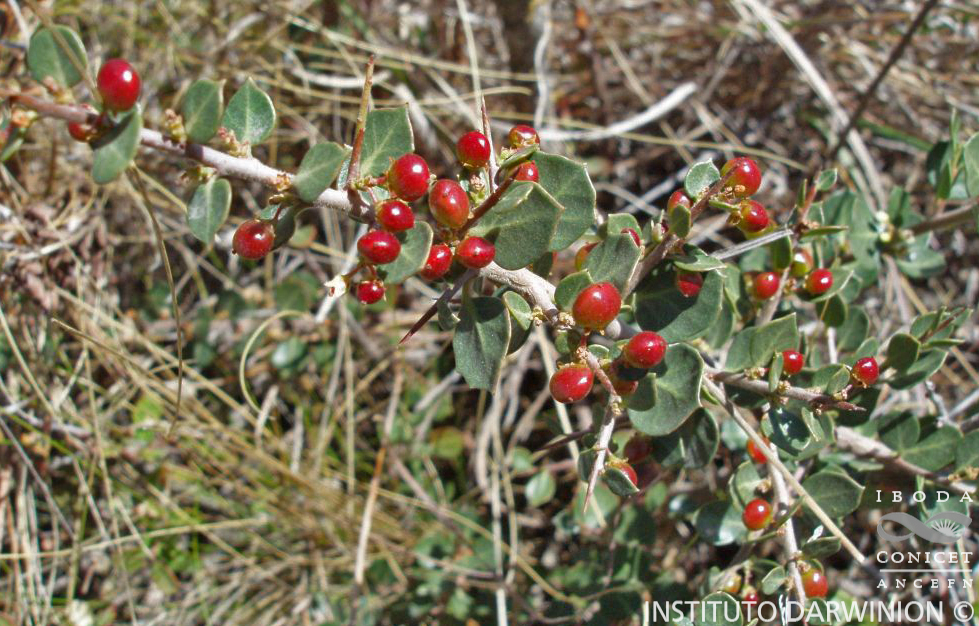 Arbustos muy ramosos, hasta de 3(-6) m de alto, diclinomonoicos; corteza castaña cuando joven, pardo-grisácea a la madurez; ramas espinescentes, divaricadas, glabras. Hojas simples, alternas; pecíolo no alado, de 0,3-1 cm de largo; lámina oblongo-elíptica, en ocasiones elíptica u obovada, de 1,5-5 × 0,5-3 cm, ápice mucronado, en ocasiones redondeado o retuso, base obtusa, margen plano a subrevoluto, entero, en ocasiones algo irregular, glabra en ambas caras, cartácea a subcartácea, venación conspicua. Inflorescencias en pseudoracimos multifloros y congestos, axilares, hasta de 0,7 cm de largo; raquis glabro o ligeramente pubescente con tricomas glandulares sésiles y brácteas isomorfas. Flores 5-meras; pedicelos ca. 3 mm de largo, notoriamente articulados; cáliz con lóbulos ca. 0,5 mm de largo; pétalos ovados, ca. 2 mm de largo, glabros, blancos o blanco-amarillentos. Flores pistiladas con gineceo ca. 1 mm de largo. Drupa de 0,3-0,5 cm de diámetro, lilacina o violácea, glabra.