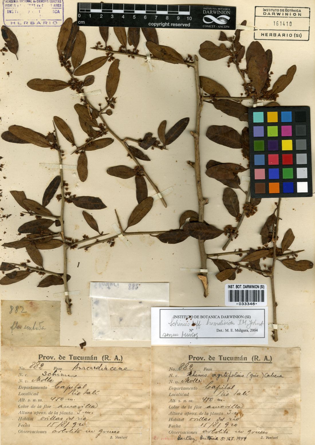 Observaciones: “Molle”, “molle blanco”, “molle negro”, “molle pispito”. En medicina popular se la emplea como febrífugo, antigripal, estomáquico y abortivo (Cantero & Núñez, 2006).
