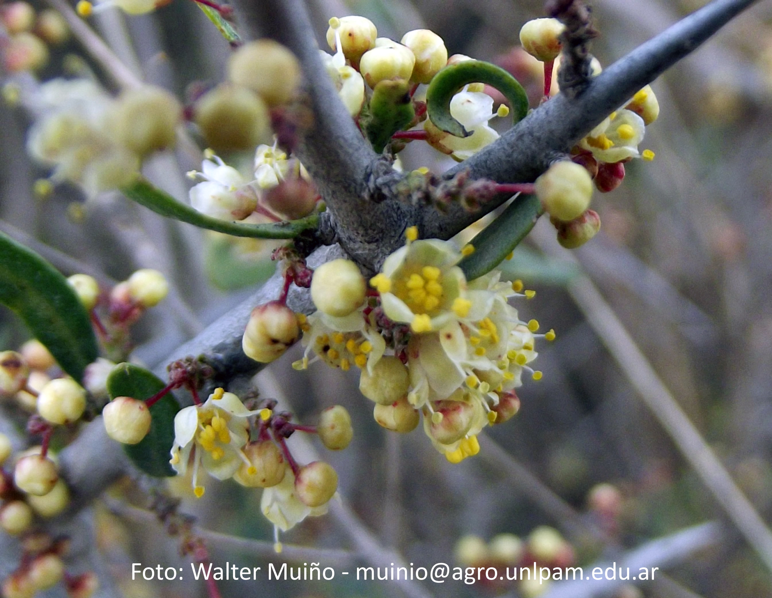 Árboles ramosos desde la base, hasta de 8 m de alto, diclino-monoicos; corteza pardo-oscura a pardo-grisácea; ramas espinescentes, divaricadas, más o menos pubescentes cuando jóvenes, glabrescentes a la madurez. Hojas simples, fasciculadas sobre braquiblastos en lasramas maduras, dimorfas; pecíolo no alado, de 0,1-0,3 cm de largo; lámina de forma muy variable, desde obovada u oblanceolada hasta obcordada o romboidal, de (0,7-)1-3 × 0,4-2 cm, ápice obtuso, en ocasiones emarginado o retuso, base cuneada, en ocasiones redondeada, margen plano a subrevoluto, entero, en ocasiones con 3-5 dientes/lóbulos apicales o repando, glabra a subglabra en la cara adaxial, pubescente en la cara abaxial, en ocasiones subglabra, cartácea a subcartácea, venación conspicua. Inflorescencias en pseudoracimos paucifloros y congestos, axilares, hasta de 1 cm de largo (hasta de 2 cm de largo en fructificación); raquis con pubescencia de tricomas extensos y tricomas glandulares capitados, brácteas isomorfas. Flores 5-meras; pedicelos ca. 1 mm de largo, notoriamente articulados; cáliz con lóbulos ca. 0,5 mm de largo; pétalos obovados, ca. 1,5 mm de largo, glabros, blancos. Flores pistiladas con gineceo ca. 1 mm de largo. Drupa de 0,3-0,5 cm de diámetro, glabra, morada a violácea