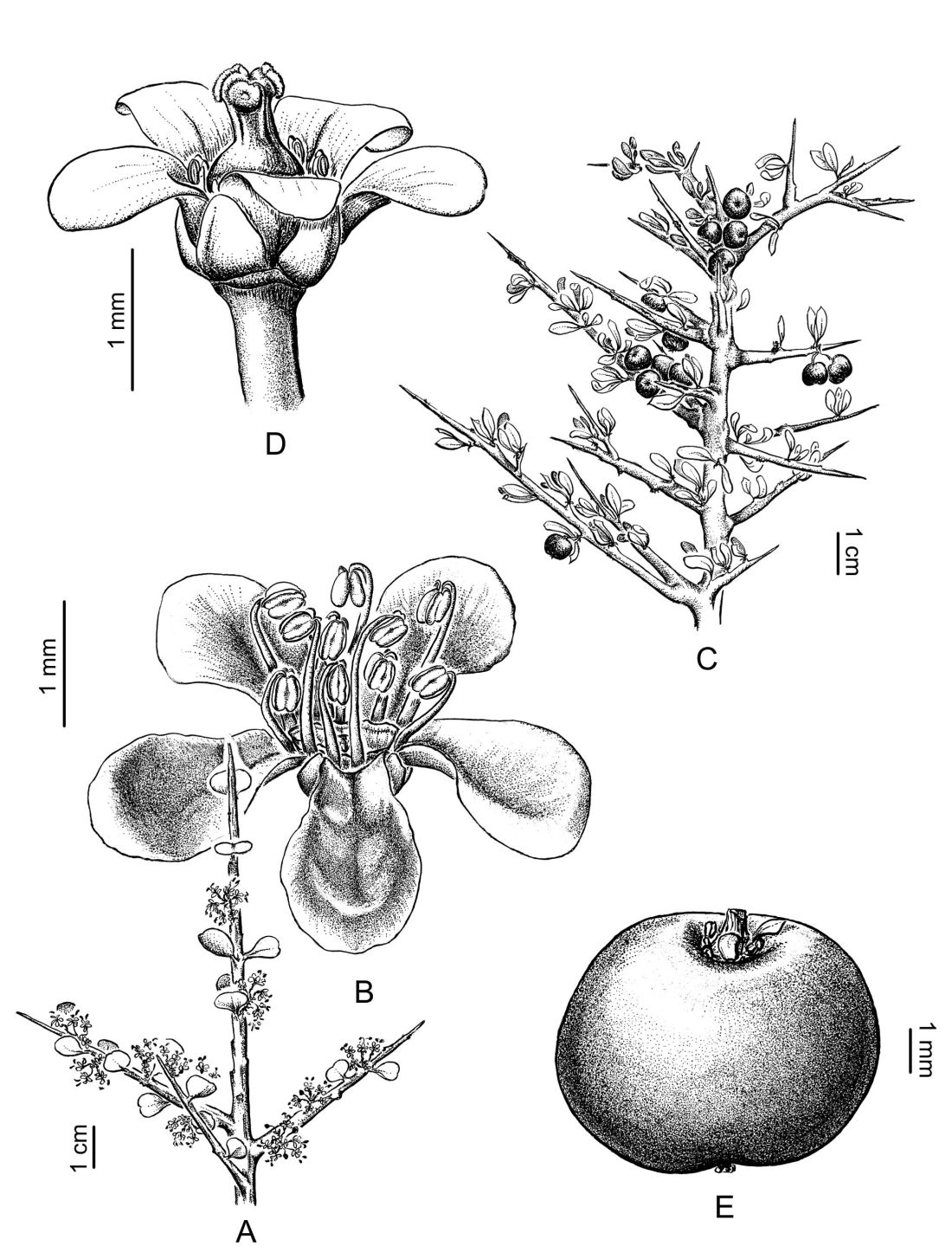 Arbustosramosos, hasta de 3 m de alto, diclino-monoicos, en ocasiones con algunas flores perfectas; corteza grisácea, estriada; ramas espinescentes, divaricadas, ocráceas o castaño-rojizas y pubescentes cuando jóvenes, luego grisáceas y glabrescentes. Hojas fasciculadas sobre braquiblastos, simples, dimorfas, subsésiles; lámina elíptica, obovada u orbicular, las mayores de 1,1-1,7 × 0,3-0,7 cm, las menores de 0,3-0,7 × 0,4-1 cm, ápice redondeado o mucronado, base aguda u obtusa, margen plano, entero, raro con unos pocos dientes inconspicuos, glabra en ambas caras, coriácea, venación conspicua. Inflorescencias en pseudoracimos multifloros y congestos, axilares, hasta de 0,5 cm de largo; raquis escasamente pubérulo y brácteas isomorfas. Flores 5-meras; pedicelos ca. 2 mm de largo, notoriamente articulados; cáliz con lóbulos ca. 1 mm de largo; pétalos obovados, de 1,5-2 mm de largo, glabros, crema o blanquecinos. Flores pistiladas con gineceo ca. 1,5 mm de largo. Drupa de 7-8 mm de diámetro, glabra, morada o violácea