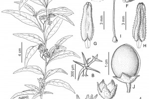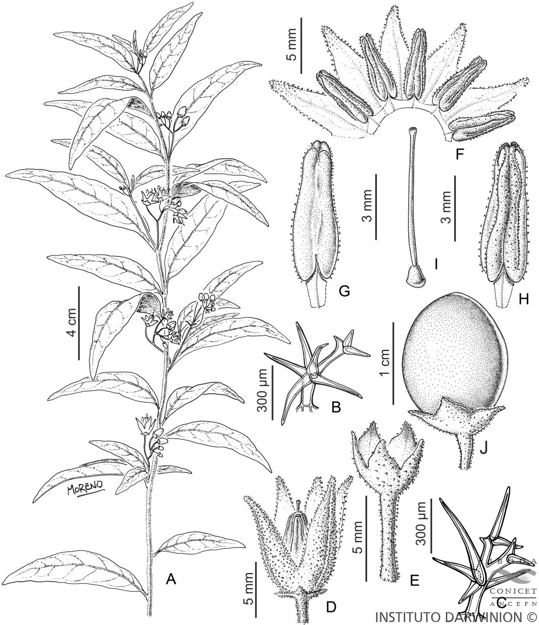 A. Rama florífera. B-C. Tricomas ramificados de la hoja. D. Flor. E. Cáliz. F. Corola desplegada. G. Estambre, vista dorsal. H. Estambre, vista ventral. I. Gineceo. J. Fruto.