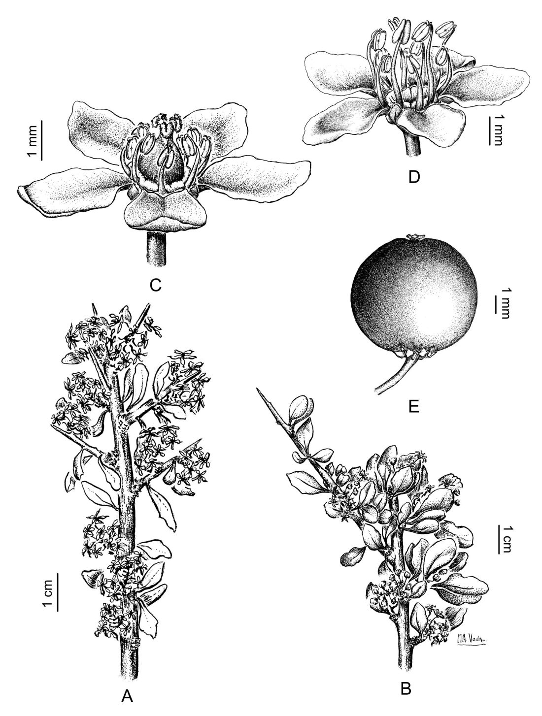 A-B. Aspecto de una rama pistilada y estaminada, respectivamente. C. Vista lateral de una flor pistilada. D. Vista lateral de una flor estaminada. E. Fruto.