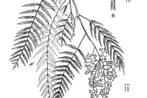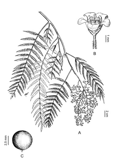 Árboles hasta de 8(-15) m de alto, diclino-monoicos; corteza pardo oscura o grisácea, áspera y escamosa, que con el paso de los años se agrieta y exfolia en placas longitudinales; ramas inermes, péndulas, algo pubérulas cuando jóvenes, glabras a la madurez, pardo claras. Hojas imparipinnadas, en ocasiones paripinnadas por aborto del folíolo terminal; pecíolo de 3-7 cm de largo, no alado; raquis no alado a subalado; folíolos en 4-7 pares, opuestos, sésiles; lámina lanceolada, de 4-8,2 × 0,5-2,1 cm, ápice largamente atenuado y mucronado, mucrón generalmente curvo, base atenuada o decurrente, margen plano, uniformemente serrado, raro subentero con dientes inconspicuos, glabra o esparcidamente pubérula cuando joven en ambas caras, subcoriácea, venación conspicua. Inflorescencias en panículas multifloras y laxas, axilares y terminales, hasta de 30 cm de largo; raquis glabro y brácteas isomorfas. Flores 5-meras; pedicelos ca. 1 mm de largo, notoriamente articulados; cáliz con lóbulos hasta de 1 mm de largo; pétalos obovados, ca. 2 mm de largo, crema o blanco-verdosos a blanco-amarillentos. Flores pistiladas con gineceo de 1-1,5 mm de largo. Drupa de 5-6 mm de diámetro, glabra, rojiza.