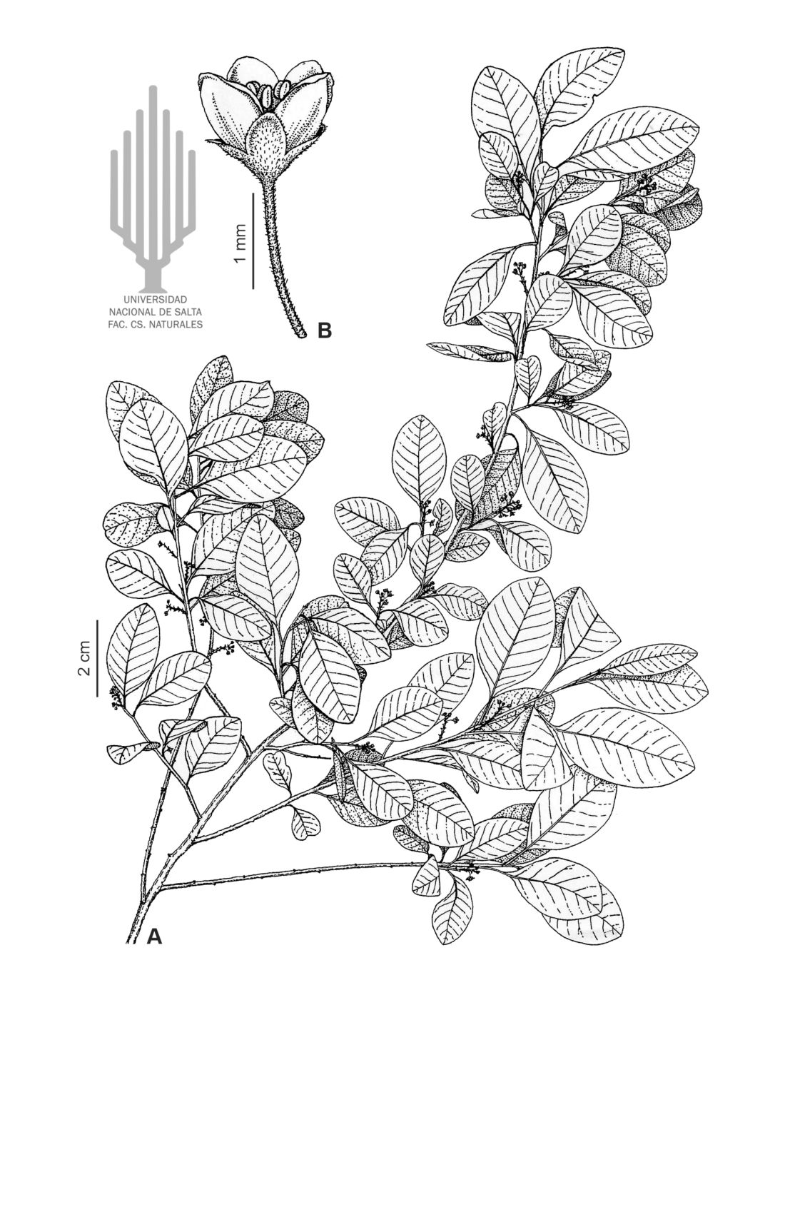 Árboles o arbustos ramosos, hasta de 7 m de alto, diclinomonoicos; ramas inermes, postradas, glabras, en ocasiones pubérulas, castañas. Hojas simples; pecíolo de 0,2-0,8(-1,1) cm de largo, no alado; lámina ampliamente elíptica a oblonga, raro ovada, de 2-6 × 1,2-3 cm, ápice obtuso, en ocasiones agudo o redondeado, base cuneada a redondeada, margen subrevoluto, entero, en ocasiones con la porción distal ligeramente crenada, más o menos estrigosa en ambas caras, membranácea a cartácea, venación conspicua. Inflorescencias axilares y terminales; brácteas isomorfas. Inflorescencias estaminadas en pseudoracimos congestos, de 1,5-3 cm de largo. Inflorescencias pistiladas en pseudoracimos congestos, raro flores solitarias, de 0,9-2,3 cm de largo. Flores 4-meras; pedicelos de 1,5-5 mm de largo, notoriamente articulados; cáliz con lóbulos de 0,6-1 mm de largo; pétalos ovados, obovados u oblongos, de 1,2-1,9 mm de largo, glabros, raro pubérulos, crema. Flores pistiladas con gineceo ca. 0,8 mm de largo. Drupa de 5,5-8 mm de diámetro, glabra o con tricomas glandulares esparcido, morada o rojiza.
