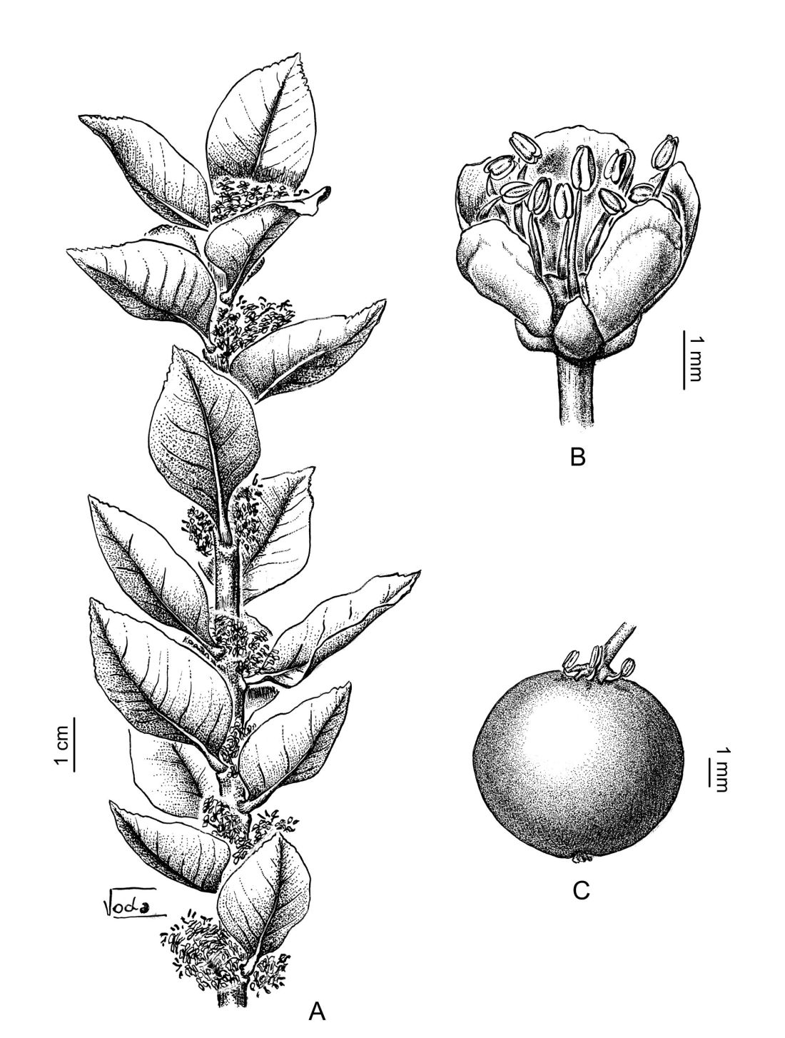 Arbustos ramosos, hasta de 5 m de alto, diclino-monoicos; corteza ocrácea o pardo-grisácea; ramas inermes, glabras, grisáceas. Hojas simples; pecíolo de 0,3-1,8 cm de largo, no alado; lámina elíptica a ovada, de 1,6-6,5 × 1,1-3,5 cm, ápice agudo, obtuso o redondeado, raro retuso, base cuneada u obtusa, margen plano a subrevoluto, entero en el tercio inferior, crenado hacia el ápice, en ocasiones sinuado, glabra en ambas caras, coriácea a subcoriácea, venación conspicua. Inflorescencias en pseudoracimos multifloros y congestos, axilares, hasta de 3 cm de largo; raquis glabro o apenas pubescente y brácteas isomorfas. Flores 5-meras; pedicelos de 3,5-7 mm de largo, notoriamente articulados; cáliz con lóbulos ca. 1 mm de largo; pétalos oblongos a ovados, de 2,5-3 mm de largo, glabros, blanco-amarillentos, blanco-verdosos o crema. Flores pistiladas con gineceo de 1-1,5 mm de largo. Drupa de 5-8 mm de diámetro, glabra, morada o violeta.