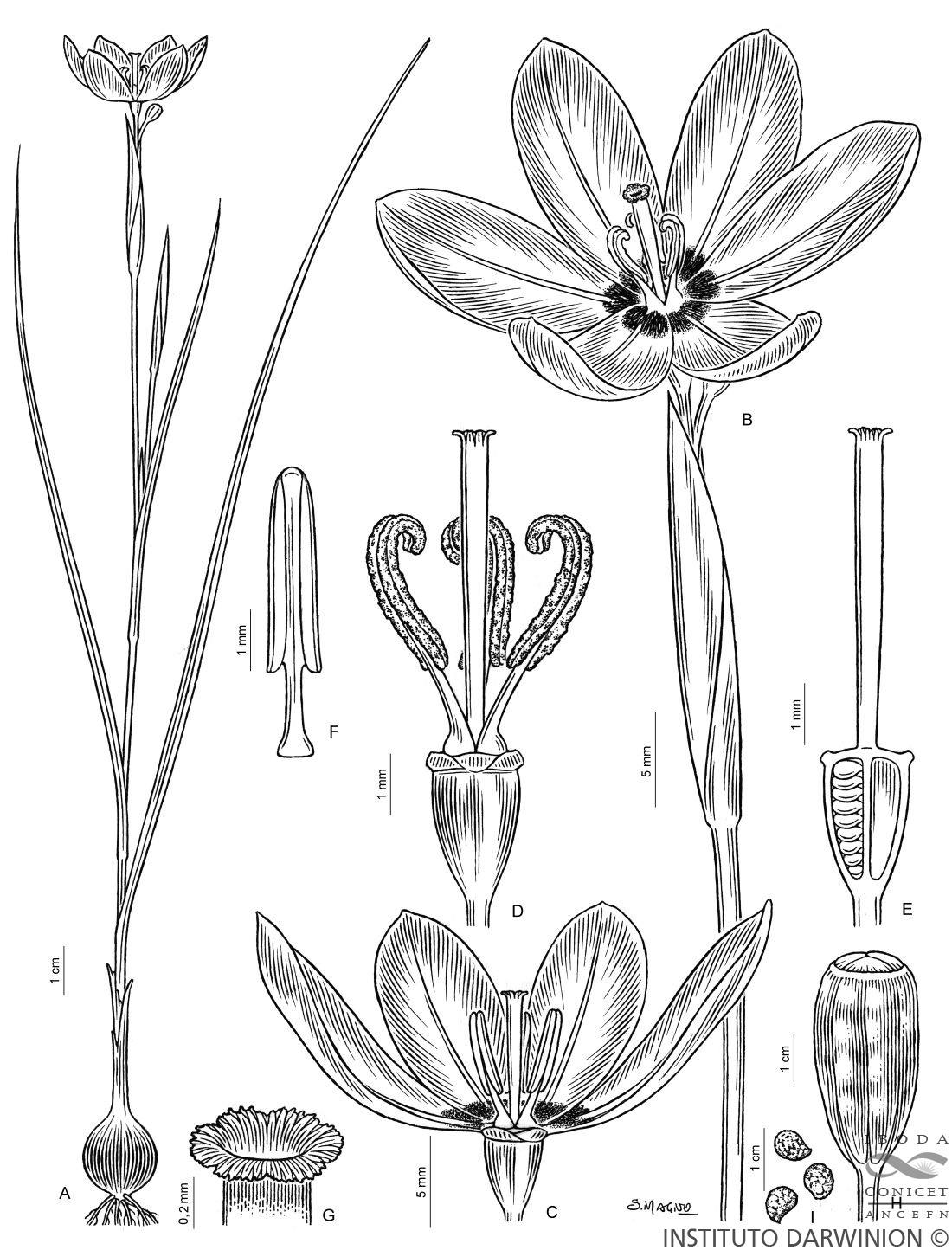 Plantas de 9-24 cm de alto. Bulbo subgloboso de 15-30 mm de diámetro, cubierto de túnicas secas pardo-oscuras que se prolongado en collar. Hojas basales de 6-15 cm × 1-2 mm, secas o ausentes durante la floración. Tallo floral muy débil, con una hoja reducida y/o 2-4 brácteas. Espatas 2-5, pedunculadas, bifloras; parcialmente marcescentes. Perigonio de color azul-violáceo o blanco-azulado, de 24-34 mm de diámetro. Tépalos de 14-20 × 5-8 mm, oblanceolados, con pequeñas estrías violáceas rodeando una mancha amarilla basal. Estambres con filamentos de 4-6 mm de largo, anteras amarillas de 4-6 mm de largo, incurvas después de la antesis. Ovario obovoide. Estilo connado de 8-9 mm de largo, área estigmática en un embudo diminuto apical, a veces algo trilobado. Cápsula obovoide-claviforme, de 6-7 × 4,5 mm. Semillas pequeñas, angulosas, pardas.