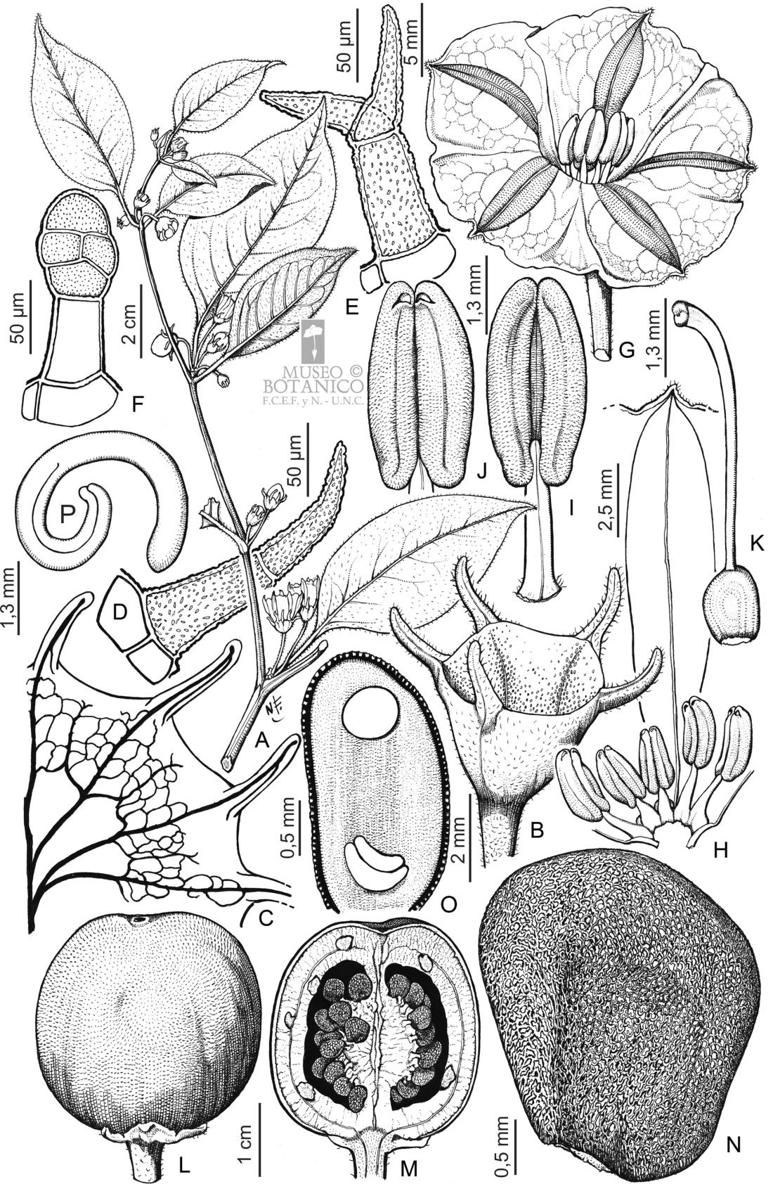 A. Rama florífera. B. Cáliz. C. Esquema de la nerviación calicinal. D. Tricoma eglandular del cáliz. E. Tricoma bifurcado del cáliz. F. Tricoma glandular del interior del cáliz. G. Flor. H. Sector de corola desplegada. I. Estambre, vista dorsal. J. Estambre, vista ventral. K. Gineceo. L. Fruto. M. Fruto, corte longitudinal. N. Semilla. O. Semilla, corte transversal. P. Embrión.