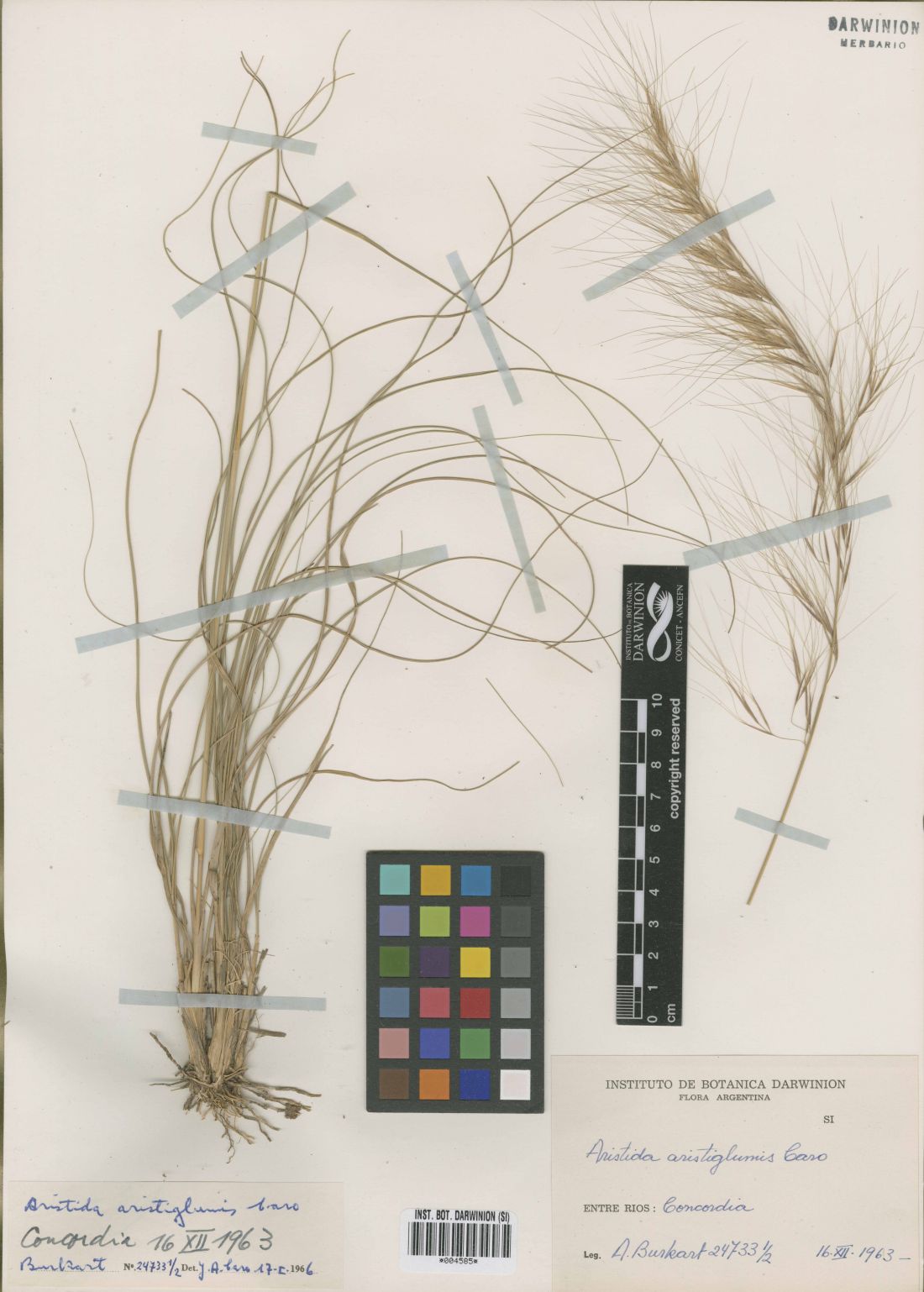 Plantas perennes, de (20-)50-90 cm de alto; cañas simples; vainas estriadas, glabras o con los márgenes cortamente pilosos hacia la porción distal, más cortas o más largas que los entrenudos; cuello de las vainas glabro; lóbulos de las vainas pilosos, con algunos pelos hialinos hasta de 4 mm de largo; lígulas pestañosas de 0,5-1 mm de largo; láminas de 8-40 cm x 0,5-2,5 mm, lineares, acuminadas, flexuosas, curvadas o circinadas, convolutas, a menudo planas hacia la base, cara abaxial escabriúscula, cara adaxial escabriúscula a escabrosa con algunos pelos hialinos hasta de 5 mm de largo cerca de la zona ligular. Inflorescencias de 12-25 x 3-6 cm incluídas las aristas, lineares, contraídas, con las ramificaciones ascendentes y arrimadas al raquis; raquis escabriúsculo, a veces glabro hacia la porción basal; ramificaciones y pedicelos escabriúsculos; glumas desiguales o subiguales en la misma panoja, 1-nervias, ápice agudo, acuminado o con arístula de 1-2,5 mm de largo; gluma inferior de 8-13 mm de largo, escabrosa sobre la quilla; gluma superior de 7-10(-12) mm de largo, glabra; lemma de 8,5-12,5 mm de largo, con o sin un apéndice hialino apical ca. 0,4 mm de largo, los márgenes involutos determinando un surco longitudinal ventral, escabriúscula en los ? superiores; callo de 0,5-0,7(-0,9) mm de largo, barbado, obtuso; aristas de 2,2-3,8(-4,2) cm, capiláceas, escabriúsculas, la central un poco más larga que las laterales, algo aplanadas y curvadas en la base, luego rectas y divergentes; pálea de 1-1,2 mm de largo, membranácea, hialina, con surco ventral, ápice brevemente 2-denticulado; lodículas 2, de 1,3-1,5 mm de largo, membranáceas, hialinas, ápice entero agudo; estambres 3, anteras de 1,7-2,2 mm de largo; cariopsis de 8-8,5 mm de largo, castaña, fusiforme, surco ventral, hilo linear recto, ventral, tan largo como la cariopsis, embrión más o menos ¼ del largo de la cariopsis.