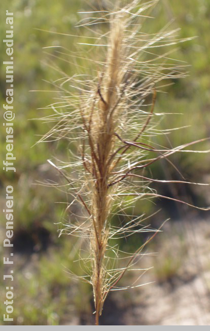 Plantas perennes, de (20-)50-90 cm de alto; cañas simples; vainas estriadas, glabras o con los márgenes cortamente pilosos hacia la porción distal, más cortas o más largas que los entrenudos; cuello de las vainas glabro; lóbulos de las vainas pilosos, con algunos pelos hialinos hasta de 4 mm de largo; lígulas pestañosas de 0,5-1 mm de largo; láminas de 8-40 cm x 0,5-2,5 mm, lineares, acuminadas, flexuosas, curvadas o circinadas, convolutas, a menudo planas hacia la base, cara abaxial escabriúscula, cara adaxial escabriúscula a escabrosa con algunos pelos hialinos hasta de 5 mm de largo cerca de la zona ligular. Inflorescencias de 12-25 x 3-6 cm incluídas las aristas, lineares, contraídas, con las ramificaciones ascendentes y arrimadas al raquis; raquis escabriúsculo, a veces glabro hacia la porción basal; ramificaciones y pedicelos escabriúsculos; glumas desiguales o subiguales en la misma panoja, 1-nervias, ápice agudo, acuminado o con arístula de 1-2,5 mm de largo; gluma inferior de 8-13 mm de largo, escabrosa sobre la quilla; gluma superior de 7-10(-12) mm de largo, glabra; lemma de 8,5-12,5 mm de largo, con o sin un apéndice hialino apical ca. 0,4 mm de largo, los márgenes involutos determinando un surco longitudinal ventral, escabriúscula en los ? superiores; callo de 0,5-0,7(-0,9) mm de largo, barbado, obtuso; aristas de 2,2-3,8(-4,2) cm, capiláceas, escabriúsculas, la central un poco más larga que las laterales, algo aplanadas y curvadas en la base, luego rectas y divergentes; pálea de 1-1,2 mm de largo, membranácea, hialina, con surco ventral, ápice brevemente 2-denticulado; lodículas 2, de 1,3-1,5 mm de largo, membranáceas, hialinas, ápice entero agudo; estambres 3, anteras de 1,7-2,2 mm de largo; cariopsis de 8-8,5 mm de largo, castaña, fusiforme, surco ventral, hilo linear recto, ventral, tan largo como la cariopsis, embrión más o menos ¼ del largo de la cariopsis.
