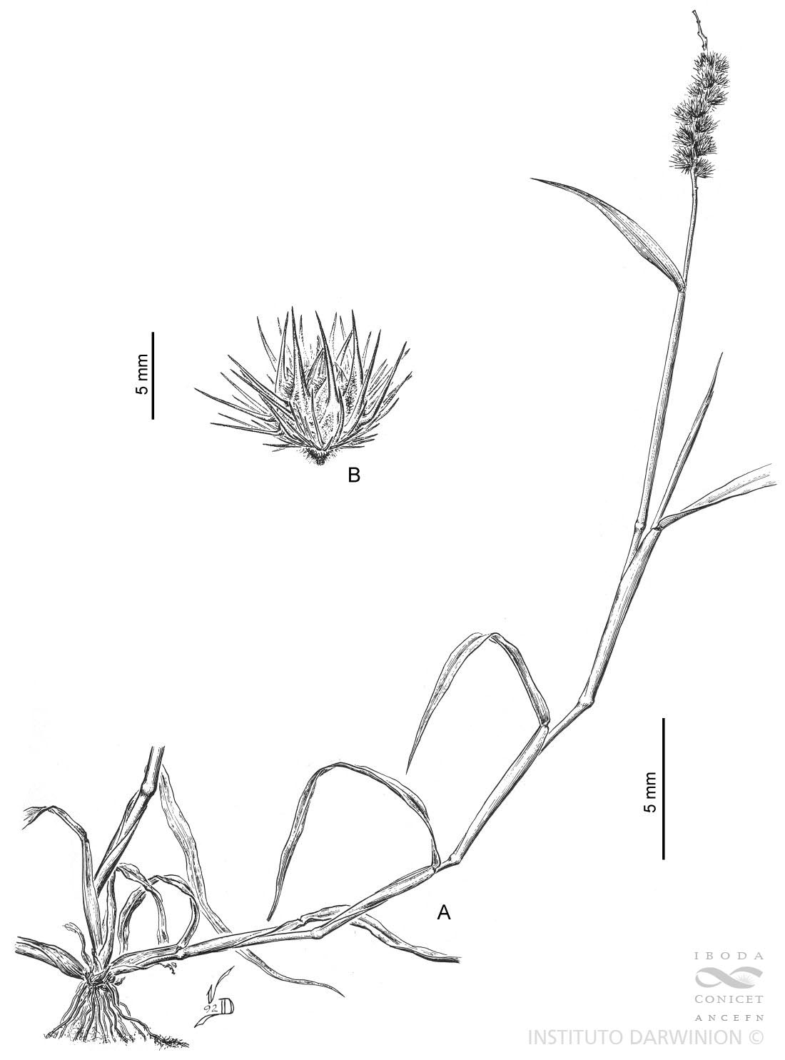 Plantas anuales, generalmente geniculadas y erguidas, a veces decumbentes; cañas herbáceas, delgadas, de 15-90 cm de alto y 3-5 mm de diámetro, nudos y entrenudos glabros; vainas comprimidas, glabras a híspidas, con pelos caedizos, márgenes pestañosos, sin yema en su axila; lígulas pestañosas, formadas por un anillo de pelos cortos, de 1-1,5 mm de largo; láminas generalmente planas, lineal-lanceoladas, de 8-30 x 0,4-1,2 cm, glabras en la cara adaxial a esparcidamente pilosas en la abaxial, con pelos largos y abundantes hacia la región ligular, de base ancha, subcordada y ápice atenuado, nervio medio inconspicuo. Inflorescencias en panojas espiciformes terminales, ± densas, elípsoides, generalmente castaño-pajizas, a veces con tonalidades violáceas, rectas, de 2,5-12 x 2-3 cm considerando las setas (0,7-1,2 cm de ancho excluyendo las setas); pedúnculos cilíndricos, filiformes, hasta de 6 cm de largo, exertos, rectos; raquis de la panoja anguloso, longitudinalmente estriado, escabroso a hirsuto, no dispuesto en zig-zag; involucro con un número variable de setas (entre 30-70), dispuestas en 3 series o grupos, la exterior con setas lineal-escabrosas, cortas (menores que la espiguilla) y libres entre sí, la serie siguiente con setas lineal-escabrosas, más gruesas, con dentículos retrorsos muy adherentes, variables en largo (menores, iguales, o hasta 2-3 mm más largas que la espiguilla) y el grupo interno formado por setas soldadas en la porción media inferior (± 2 mm de alto o más), de base ancha y márgenes ciliados a pilosos, formando un involucro endurecido en íntimo contacto con las espiguillas. Espiguillas ovado-lanceoladas, dispuestas 2-4(-5) por involucro, glabras a pubérulas, pediceladas, una mayor y la(s) restante(s) algo menor(es), de 3-6,5 x 1-1,5 mm, 2-floras, con el antecio inferior generalmente neutro, rara vez estaminado y el superior perfecto, pedicelo pubescente; gluma superior y lemma inferior subiguales; gluma inferior ovado-lanceolada, membranácea, de 0,5-2,5 mm de largo, 1-nervia, de ápice agudo; gluma superior membranácea, de 2,5-5,5 mm de largo, 3-5-nervia, de ápice agudo; lemma inferior glumiforme, de 3-6 x 1,5-2 mm, 5-nervia, de ápice agudo; pálea inferior angostamente lanceolada, menor o igual a la lemma contigua; lemma superior ovado-lanceolada, glabra, de 3,5-6,5 x 1,5-2 mm, 5-nervia, de ápice agudo; pálea superior de igual largo que la lemma; estambres 3, anteras de 1,5-2,5 mm de largo, de ápice glabro, con los filamentos estaminales rara vez exertos; gineceo con las ramas estigmáticas exertas, de 1,5-2,5 mm de largo, estilos sólo soldados en su base; cariopsis ovoide, de 2-3 mm de largo.