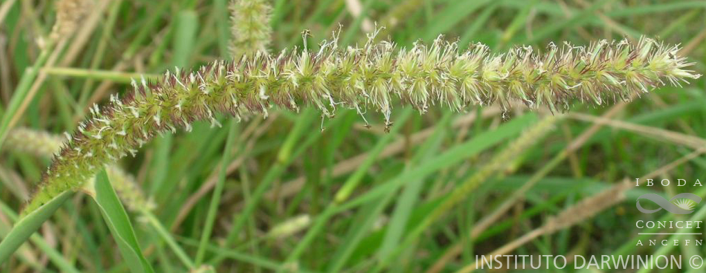 Plantas anuales, generalmente geniculadas y erguidas, a veces decumbentes; cañas herbáceas, delgadas, de 15-90 cm de alto y 3-5 mm de diámetro, nudos y entrenudos glabros; vainas comprimidas, glabras a híspidas, con pelos caedizos, márgenes pestañosos, sin yema en su axila; lígulas pestañosas, formadas por un anillo de pelos cortos, de 1-1,5 mm de largo; láminas generalmente planas, lineal-lanceoladas, de 8-30 x 0,4-1,2 cm, glabras en la cara adaxial a esparcidamente pilosas en la abaxial, con pelos largos y abundantes hacia la región ligular, de base ancha, subcordada y ápice atenuado, nervio medio inconspicuo. Inflorescencias en panojas espiciformes terminales, ± densas, elípsoides, generalmente castaño-pajizas, a veces con tonalidades violáceas, rectas, de 2,5-12 x 2-3 cm considerando las setas (0,7-1,2 cm de ancho excluyendo las setas); pedúnculos cilíndricos, filiformes, hasta de 6 cm de largo, exertos, rectos; raquis de la panoja anguloso, longitudinalmente estriado, escabroso a hirsuto, no dispuesto en zig-zag; involucro con un número variable de setas (entre 30-70), dispuestas en 3 series o grupos, la exterior con setas lineal-escabrosas, cortas (menores que la espiguilla) y libres entre sí, la serie siguiente con setas lineal-escabrosas, más gruesas, con dentículos retrorsos muy adherentes, variables en largo (menores, iguales, o hasta 2-3 mm más largas que la espiguilla) y el grupo interno formado por setas soldadas en la porción media inferior (± 2 mm de alto o más), de base ancha y márgenes ciliados a pilosos, formando un involucro endurecido en íntimo contacto con las espiguillas. Espiguillas ovado-lanceoladas, dispuestas 2-4(-5) por involucro, glabras a pubérulas, pediceladas, una mayor y la(s) restante(s) algo menor(es), de 3-6,5 x 1-1,5 mm, 2-floras, con el antecio inferior generalmente neutro, rara vez estaminado y el superior perfecto, pedicelo pubescente; gluma superior y lemma inferior subiguales; gluma inferior ovado-lanceolada, membranácea, de 0,5-2,5 mm de largo, 1-nervia, de ápice agudo; gluma superior membranácea, de 2,5-5,5 mm de largo, 3-5-nervia, de ápice agudo; lemma inferior glumiforme, de 3-6 x 1,5-2 mm, 5-nervia, de ápice agudo; pálea inferior angostamente lanceolada, menor o igual a la lemma contigua; lemma superior ovado-lanceolada, glabra, de 3,5-6,5 x 1,5-2 mm, 5-nervia, de ápice agudo; pálea superior de igual largo que la lemma; estambres 3, anteras de 1,5-2,5 mm de largo, de ápice glabro, con los filamentos estaminales rara vez exertos; gineceo con las ramas estigmáticas exertas, de 1,5-2,5 mm de largo, estilos sólo soldados en su base; cariopsis ovoide, de 2-3 mm de largo.