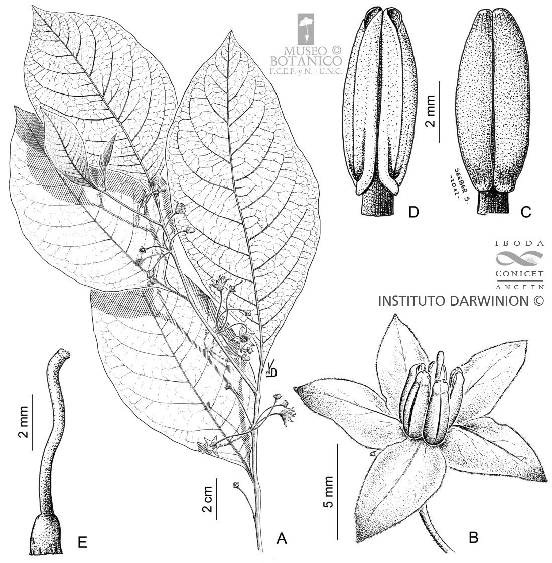 Arbustos o arbolitos de 1-10 m de alto; ramas y hojas jóvenes con pubescencia aracnoidea densa, que confieren textura afelpada, prontamente caducos; corteza de las ramas viejas castaño grisácea, con lenticelas blancuzcas. Unidades simpodiales 2-foliadas, geminadas. Hojas maduras con láminas elípticas, con el ancho máximo en la zona media, ápice y base agudos; epifilo glabro, generalmente abullonado, a veces con algunos tricomas aracnoideos en el nervio medio; hipofilo glabro o con algunos tricomas en los nervios principales; hojas mayores con pecíolos de (7-)10-15(-20) mm, láminas de 4-18(-30) × 2-11(-28) cm, nervios laterales 10-14 pares impresos en el hipofilo; hojas menores sólo difiriendo en tamaño, pecíolos de 3-10 mm, láminas de 3-9 × 1,5-5 cm. Inflorescencia opuesta a las hojas, (2-)5- 7(-15)-flora, glabra o con tricomas aracnoideos esparcidos, pedúnculo casi nulo. Pedicelos de 15-25 mm, delgados; cicatrices de los pedicelos muy próximas entre sí; cáliz acampanado, tubo de 1-2 mm, lóbulos anchamente deltoides, de 1-2 mm, obtusos, apiculados, glabros u ocasionalmente con algunos tricomas dendríticos; corola partida casi hasta la base, de (12-)15-16 (-22) mm de diámetro, blanca o blanco-verdosa, lóbulos anchamente lanceolados de 6-8 × 3-4 mm, planos en la antesis, con puntas y márgenes papilosos, externamente pilosos; filamentos con su porción libre ca. 0,5 mm, porción fusionada de 0,5-1 mm, anteras de 4-6 × 1-2 mm, dehiscentes por poros apicales en forma de gota; ovario glabro, estilo de 6-10 mm, glabro o con algunos tricomas, estigma levemente clavado, papiloso. Baya esférica u ovoide, de (8-)10-15 mm de diámetro y hasta 20 mm de largo, verde-grisácea en la madurez; pedicelo fructífero leñoso, reflexo, hasta de 2,5 cm; semillas reniformes, de 2,5-3,5 mm, castañas, finamente foveoladas.