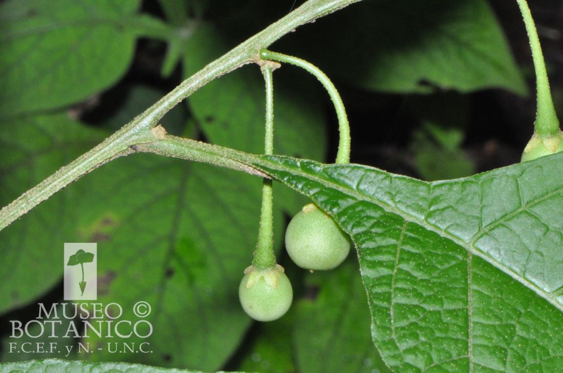 Arbustos o arbolitos de 1-10 m de alto; ramas y hojas jóvenes con pubescencia aracnoidea densa, que confieren textura afelpada, prontamente caducos; corteza de las ramas viejas castaño grisácea, con lenticelas blancuzcas. Unidades simpodiales 2-foliadas, geminadas. Hojas maduras con láminas elípticas, con el ancho máximo en la zona media, ápice y base agudos; epifilo glabro, generalmente abullonado, a veces con algunos tricomas aracnoideos en el nervio medio; hipofilo glabro o con algunos tricomas en los nervios principales; hojas mayores con pecíolos de (7-)10-15(-20) mm, láminas de 4-18(-30) × 2-11(-28) cm, nervios laterales 10-14 pares impresos en el hipofilo; hojas menores sólo difiriendo en tamaño, pecíolos de 3-10 mm, láminas de 3-9 × 1,5-5 cm. Inflorescencia opuesta a las hojas, (2-)5- 7(-15)-flora, glabra o con tricomas aracnoideos esparcidos, pedúnculo casi nulo. Pedicelos de 15-25 mm, delgados; cicatrices de los pedicelos muy próximas entre sí; cáliz acampanado, tubo de 1-2 mm, lóbulos anchamente deltoides, de 1-2 mm, obtusos, apiculados, glabros u ocasionalmente con algunos tricomas dendríticos; corola partida casi hasta la base, de (12-)15-16 (-22) mm de diámetro, blanca o blanco-verdosa, lóbulos anchamente lanceolados de 6-8 × 3-4 mm, planos en la antesis, con puntas y márgenes papilosos, externamente pilosos; filamentos con su porción libre ca. 0,5 mm, porción fusionada de 0,5-1 mm, anteras de 4-6 × 1-2 mm, dehiscentes por poros apicales en forma de gota; ovario glabro, estilo de 6-10 mm, glabro o con algunos tricomas, estigma levemente clavado, papiloso. Baya esférica u ovoide, de (8-)10-15 mm de diámetro y hasta 20 mm de largo, verde-grisácea en la madurez; pedicelo fructífero leñoso, reflexo, hasta de 2,5 cm; semillas reniformes, de 2,5-3,5 mm, castañas, finamente foveoladas.