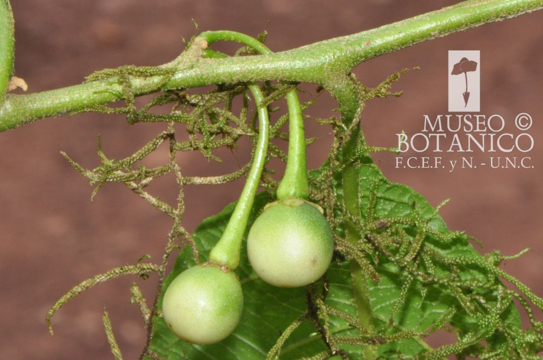 Arbustos o arbolitos de 1-10 m de alto; ramas y hojas jóvenes con pubescencia aracnoidea densa, que confieren textura afelpada, prontamente caducos; corteza de las ramas viejas castaño grisácea, con lenticelas blancuzcas. Unidades simpodiales 2-foliadas, geminadas. Hojas maduras con láminas elípticas, con el ancho máximo en la zona media, ápice y base agudos; epifilo glabro, generalmente abullonado, a veces con algunos tricomas aracnoideos en el nervio medio; hipofilo glabro o con algunos tricomas en los nervios principales; hojas mayores con pecíolos de (7-)10-15(-20) mm, láminas de 4-18(-30) × 2-11(-28) cm, nervios laterales 10-14 pares impresos en el hipofilo; hojas menores sólo difiriendo en tamaño, pecíolos de 3-10 mm, láminas de 3-9 × 1,5-5 cm. Inflorescencia opuesta a las hojas, (2-)5- 7(-15)-flora, glabra o con tricomas aracnoideos esparcidos, pedúnculo casi nulo. Pedicelos de 15-25 mm, delgados; cicatrices de los pedicelos muy próximas entre sí; cáliz acampanado, tubo de 1-2 mm, lóbulos anchamente deltoides, de 1-2 mm, obtusos, apiculados, glabros u ocasionalmente con algunos tricomas dendríticos; corola partida casi hasta la base, de (12-)15-16 (-22) mm de diámetro, blanca o blanco-verdosa, lóbulos anchamente lanceolados de 6-8 × 3-4 mm, planos en la antesis, con puntas y márgenes papilosos, externamente pilosos; filamentos con su porción libre ca. 0,5 mm, porción fusionada de 0,5-1 mm, anteras de 4-6 × 1-2 mm, dehiscentes por poros apicales en forma de gota; ovario glabro, estilo de 6-10 mm, glabro o con algunos tricomas, estigma levemente clavado, papiloso. Baya esférica u ovoide, de (8-)10-15 mm de diámetro y hasta 20 mm de largo, verde-grisácea en la madurez; pedicelo fructífero leñoso, reflexo, hasta de 2,5 cm; semillas reniformes, de 2,5-3,5 mm, castañas, finamente foveoladas.