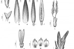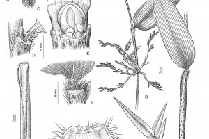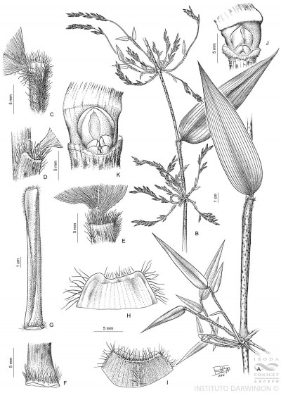 Plantas con cañas huecas o fistulosas, erguidas, de 2-3 m de alto y 1-1,5 cm de diámetro en la base, 4 mm en la parte distal; nudos pilosos a hirsutos, cubiertos de pelos rojizos, tiesos cuando jóvenes, fácilmente caducos; entrenudos largos hasta de 30 cm; hojas de la caña con vainas pubescentes, estriadas, densamente pestañosas en el borde y en el cuello, con manchas violáceas rectangulares, pequeñas y a menudo confluentes, láminas persistentes o decíduas; ramas delgadas y huecas; hojas de las ramificaciones con vainas hirsutas, seudopecíolo pubescente, láminas de 15-22 x 3-4,5 cm, lanceoladas, asimétricas en la base, membranáceas; ramas floríferas hasta de 70 cm de largo. Inflorescencias de 1,5-4 cm de largo, formadas por espiguillas dispuestas en racimos o en glomérulos, raquis breve, generalmente oculto por las espiguillas. Espiguillas glabras, violáceas, de 1 cm de largo; glumas papiráceas, menores de 1 mm de largo, truncadas o apenas redondeadas; glumelas estériles lanceoladas, papiráceas, 5-nervias, glabras, la inferior de 4,5 mm de largo, es más aguda que la superior que alcanza 5,5 mm; glumela fértil aquillada, glabra, 7-nervia, de 9 mm de largo; pálea 4-nervia, 2-aquillada, papirácea, con el ápice pubescente, iguala o apenas supera a la glumela; estambres con anteras péndulas, amarillentas; lodículas 3, membranosas, ciliadas, cariopsis no vista.