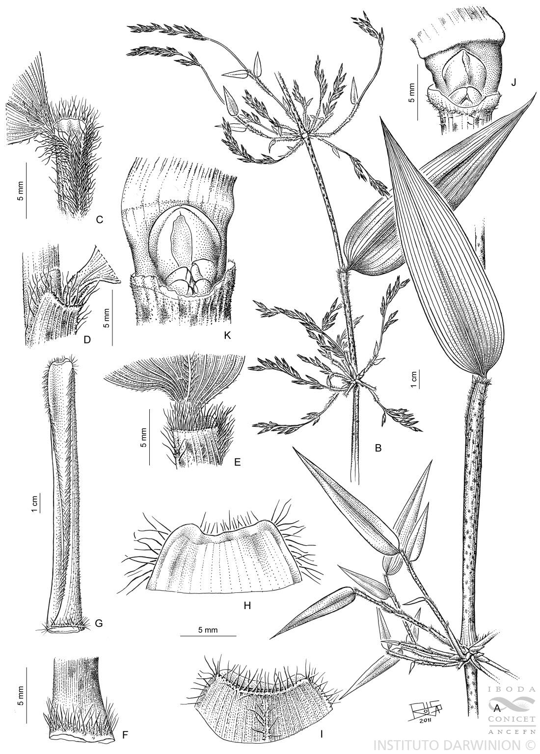 Plantas con cañas huecas o fistulosas, erguidas, de 2-3 m de alto y 1-1,5 cm de diámetro en la base, 4 mm en la parte distal; nudos pilosos a hirsutos, cubiertos de pelos rojizos, tiesos cuando jóvenes, fácilmente caducos; entrenudos largos hasta de 30 cm; hojas de la caña con vainas pubescentes, estriadas, densamente pestañosas en el borde y en el cuello, con manchas violáceas rectangulares, pequeñas y a menudo confluentes, láminas persistentes o decíduas; ramas delgadas y huecas; hojas de las ramificaciones con vainas hirsutas, seudopecíolo pubescente, láminas de 15-22 x 3-4,5 cm, lanceoladas, asimétricas en la base, membranáceas; ramas floríferas hasta de 70 cm de largo. Inflorescencias de 1,5-4 cm de largo, formadas por espiguillas dispuestas en racimos o en glomérulos, raquis breve, generalmente oculto por las espiguillas. Espiguillas glabras, violáceas, de 1 cm de largo; glumas papiráceas, menores de 1 mm de largo, truncadas o apenas redondeadas; glumelas estériles lanceoladas, papiráceas, 5-nervias, glabras, la inferior de 4,5 mm de largo, es más aguda que la superior que alcanza 5,5 mm; glumela fértil aquillada, glabra, 7-nervia, de 9 mm de largo; pálea 4-nervia, 2-aquillada, papirácea, con el ápice pubescente, iguala o apenas supera a la glumela; estambres con anteras péndulas, amarillentas; lodículas 3, membranosas, ciliadas, cariopsis no vista.