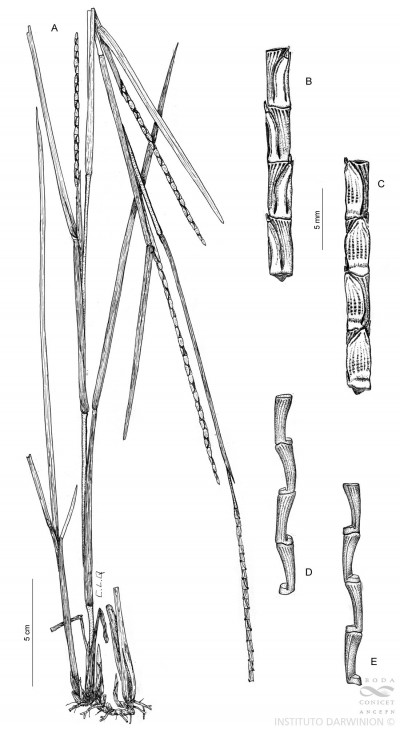 Hierbas perennes de 10-75 cm de alto, rizomatosas; innovaciones extravaginales; cañas comprimidas, 2-8 nodes; vainas carinadas, las caulinares más cortas que los entrenudos; láminas, lineares, planas o conduplicadas, de 5-35 cm x 2-6 mm. Inflorescencia formada por racimos espiciformes cilíndricos o subcilíndricos, simples, terminales y axilares, rectos o levemente curvos, los terminales exertos a la madurez, los axilares 1-5, subincluidos en la hoja tectriz; artejos del raquis huecos, de 4-5,5 mm de largo, dilatados hacia la extremidad distal. Espiguilla sésil de longitud aproximada al artejo, comprimida dorsiventralmente; gluma inferior de 4 x 2-2,5 mm, coriácea, 2-aquillada, quilla alada hacia el extremo distal, dorso algo convexo, con cavidades dispuestas longitudinalmente en los espacios internervales; gluma superior 3-nervia, navicular; lemma estéril, lanceolada, papirácea; lemma fértil 1-carinada, hialina; pálea hialina. Espiguilla pedicelada de 1-1,5 mm de largo, estéril, pedicelo comprimido, recto o algo falcado, poco menor que el artejo.