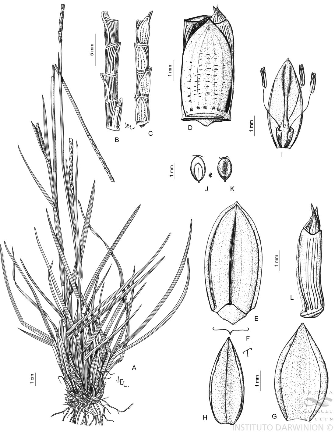 A. Planta. B-C. Porción del raquis con espiguillas. D. Porción del raquis, mostrando espiguillas sésil y fértil, vista dorsal, detrás el raquis y un pedicelo con espiguilla reducida. E. Espiguilla sésil, vista dorsal. F. Gluma superior de la espiguilla sésil, transcorte. G. Lemma estéril. H. Lemma fértil. I. Flor con la pálea. J. Cariopsis, vista escutelar. K. Cariopsis, vista hilar. L. Espiguilla pedicelada.