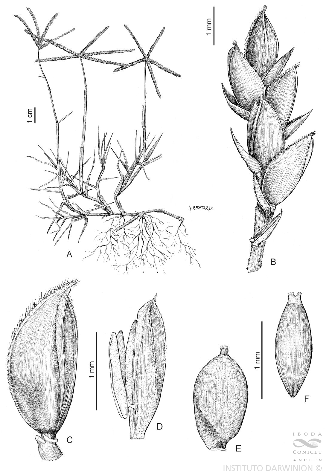 Plantas perennes, rastreras, estoloníferas, radicantes en los nudos inferiores; cañas floríferas más o menos erguidas hasta de 40 cm de alto; vainas glabras (excepto la región ligular que presenta pelos largos), comprimidas lateralmente; lígulas membranáceo-ciliadas hasta de 0,5 mm de largo; láminas lineares, de 0,5-15 cm x 1-4 mm, planas o conduplicadas, glabras a hirsutas; prefoliación conduplicada. Inflorescencia formada por 2-8 racimos unilaterales, digitados; raquis de los racimos de 1,2-6 cm de largo, triquetro. Espiguillas anchamente elipsoides, de 2-2,5 mm de largo; 1-2(-3) floras; glumas generalmente desiguales, 1-nervias, la inferior hasta ½ ó mayor que la longitud del antecio, la superior desde ?-¾ y hasta superando la longitud del mismo, de ápice mútico o aristulado; lemma tan larga como la espiguilla, lisa, pajiza, comprimida lateralmente, carenada, con la carena brevemente ciliolada, mútica o mucronulada en el ápice; pálea de similar consistencia que la lemma, 2-nervada, glabra; raquilla prolongada, setiforme; cariopsis subelipsoidea, ca. 1 mm de largo, comprimida lateralmente, castaña.