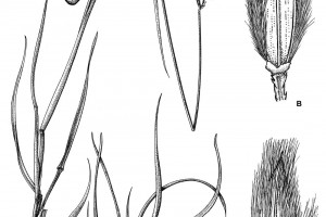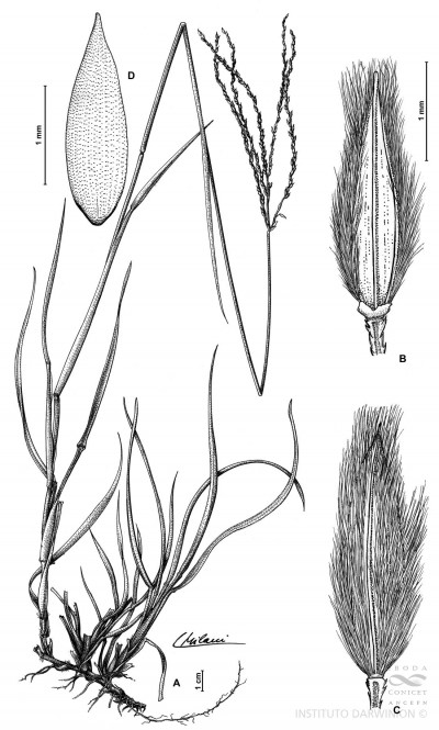 Plantas de 25-70 cm de alto, decumbentes en la base, enraizadas en los nudos inferiores; cañas de 2 mm de diámetro, glabras; nudos castaños, comprimidos, glabros; vainas inferiores laxamente hirsutas, las superiores glabras; lígulas de 3-3,5 mm de largo, membranáceas, obtusas; zona ligular glabra; láminas de 6-10 cm x 4-5 mm, angostamente lanceoladas de ápice acuminado, planas, glabras. Panícula subdigitada de 12-15 cm de largo, con 5-10 racimos alternos sobre un eje ca. 3 cm de largo; pulvínulos en la axila de los racimos castaños, glabrescentes; raquis de 0,3-0,4 mm de ancho, triquetro, escabroso; pedicelos de 1-3 mm de largo, escabrosos. Espiguillas de 2,5-2,7 x 0,7 mm, en grupos de 2, distantes entre sí por entrenudos de 3-4,5 mm de largo, casmógamas, pilosas; indumento formado por pelos lineares de hasta 2 mm de largo, ápice agudo, blanquecinos con tintes purpúreos; gluma inferior de 0,1 mm de largo, membranácea, rudimentaria o ausente; gluma superior (3-)5-nervia, nervio medio distante de los marginales, ápice agudo, densamente pilosa en zonas internerviales y marginales; lemma inferior tan larga como la espiguilla, ápice acuminado, 7-nervia, nervio medio distante de los marginales contiguos, glabra a ambos lados del nervio medio y alternadamente pilosa y glabra en las zonas restantes; antecio subigual a la espiguilla, 0,2-0,3 mm menor, pajizo con tintes purpúreos; lodículas 2, cordiformes; anteras de 1-1,5 mm de largo, amarillas con tintes purpúreos; estigmas purpúreos; cariopsis generalmente de 1 x 0,4 mm; hilo aovado; embrión de 0,4 mm de largo.