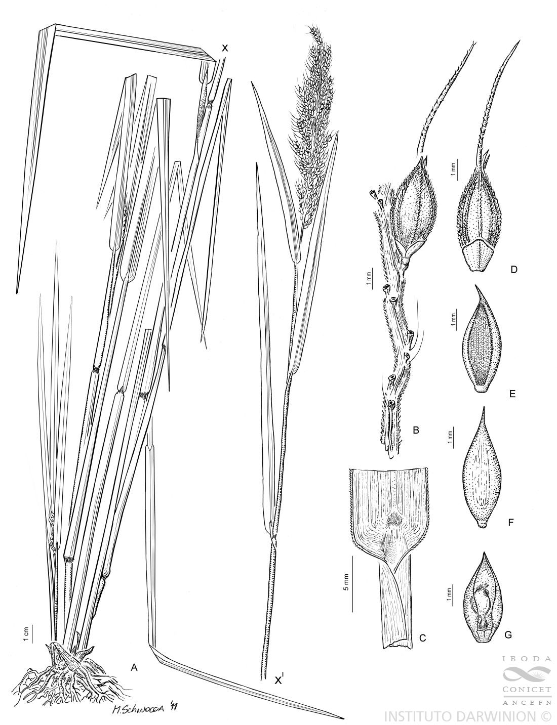 A. Planta. B. Porción de un racimo de la inflorescencia. C. Región ligular. D. Espiguilla vista ventral. E. Antecio superior vista ventral. F. Antecio superior vista dorsal. G. Pálea superior con lodículas y gineceo.