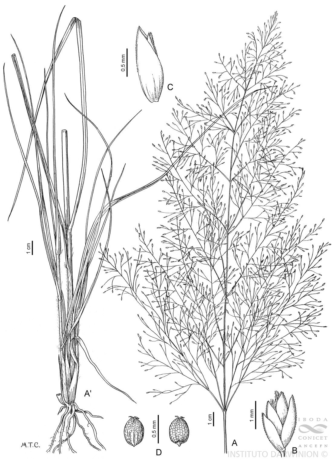 Plantas perennes, cespitosas, con innovaciones, eglandulosas; cañas de 30-110 cm de alto, erectas, glabras por debajo de los nudos; vainas glabras o pilosas, los tricomas hasta de 5 mm de largo; lígulas de 0,1-0,2 mm de largo; láminas planas a enrolladas, de 8-22 cm x (1-)2-4(-5) mm, abaxialmente glabras, adaxialmente escabriúsculas. Inflorescencias de 18-70 x 3-25 cm, difusas, ovadas; ramificaciones primarias de 4-20 cm de largo, adpresas o divergentes en ángulos de 10º-70° con relación al raquis, proximalmente desnudas; pulvínulos glabros; pedicelos de 2,4-11 mm de largo, divergentes. Espiguillas de 1,3-2 x 0,8-1,8 mm, con 1-3 antecios, ovadas a lanceoladas, plomizas; desarticulación acrópeta, en la raquilla por debajo de los antecios, glumas caducas; raquilla prolongada por encima del antecio terminal; glumas lanceoladas a ovadas, membranáceas; gluma inferior de 0,8-1 mm de largo; gluma superior de 1,1-1,4 mm de largo; lemma de 0,8-1,2 mm de largo, ovada, membranácea, plomiza, carinas y nervios laterales inconspicuos, ápice obtuso; pálea de 0,8-1,2 mm de largo, membranácea, las bases sin proyectarse más allá de la lemma, el ápice obtuso; estambres 3, anteras de 0,3-0,5 mm de largo, purpúreas; cariopsis de 0,4-0,5 mm de largo, ovoidea, reticulada, rojiza a castaña.