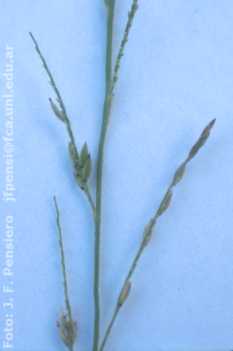 Plantas perennes, de 40-100 cm de alto, cortamente rizomatosas; cañas erectas o geniculadas en la base, con 3-10 entrenudos de 3-18 cm de largo, estriados, glabros; nudos castaños, glabros; vainas de 3-11 cm de largo, generalmente más cortas que los entrenudos, glabras o raro puberulentas, los márgenes membranáceo-ciliolados; lígulas pestañosas de 0,4-1,2 mm de largo; cuello pubescente; láminas lineares a linear-lanceoladas, planas, de 7-40 x 0,4-1 cm, glabras, márgenes escabriúsculos, ápice acuminado. Inflorescencias de 14-45 x 2-5 cm; pedúnculo terete, glabro o esparcidamente piloso; eje principal de 8-20 cm de largo, anguloso, piloso, pelos blanquecinos de hasta 1,5 mm de largo, con 7-22 ramificaciones de primer orden alternas, bilaterales, adpresas al eje o divergentes; raquis de las ramificaciones de 1,5-6 cm x 0,4-0,6 mm, triquetro, piloso, márgenes escabriúsculos; pedicelos de hasta 1,25 mm de largo, escabrosos, de ápice cupuliforme; espiguillas de a pares , una corta y la otra largamente pedicelada, o solitarias hacia el ápice. Espiguillas lanceoladas, de 4-5 x 1-1,2 mm, tempranamente caedizas, articuladas en la base junto al pedicelo; callo cupuliforme de 0,3-0,5 mm de diámetro, violáceo; gluma inferior ausente; gluma superior de 3,8-4,7 mm de largo, pilosa en los ? inferiores, escabriúscula sobre los márgenes hacia la región superior, ápice acuminado, 5-7-nervia; lemma inferior glumiforme, hasta 0,35 mm más corta que la gluma superior, 5-7-nervia; pálea inferior ausente y flor inferior neutra; antecio superior elipsoide, de 2-3,5 x 0,8-1 mm (excluyendo la arista), pajizo, coriáceo, papiloso en toda su superficie; lemma superior aristada en el ápice, arista de 0,8-1,3(-1,5) de largo , recta, con macropelos cortos y rígidos; pálea superior de similar textura que la lemma, de ápice obtuso; anteras de 1,1-1,2 mm de largo; cariopsis elipsoide, castaña; hilo oval-punctiforme; embrión ½ del largo de la cariopsis.