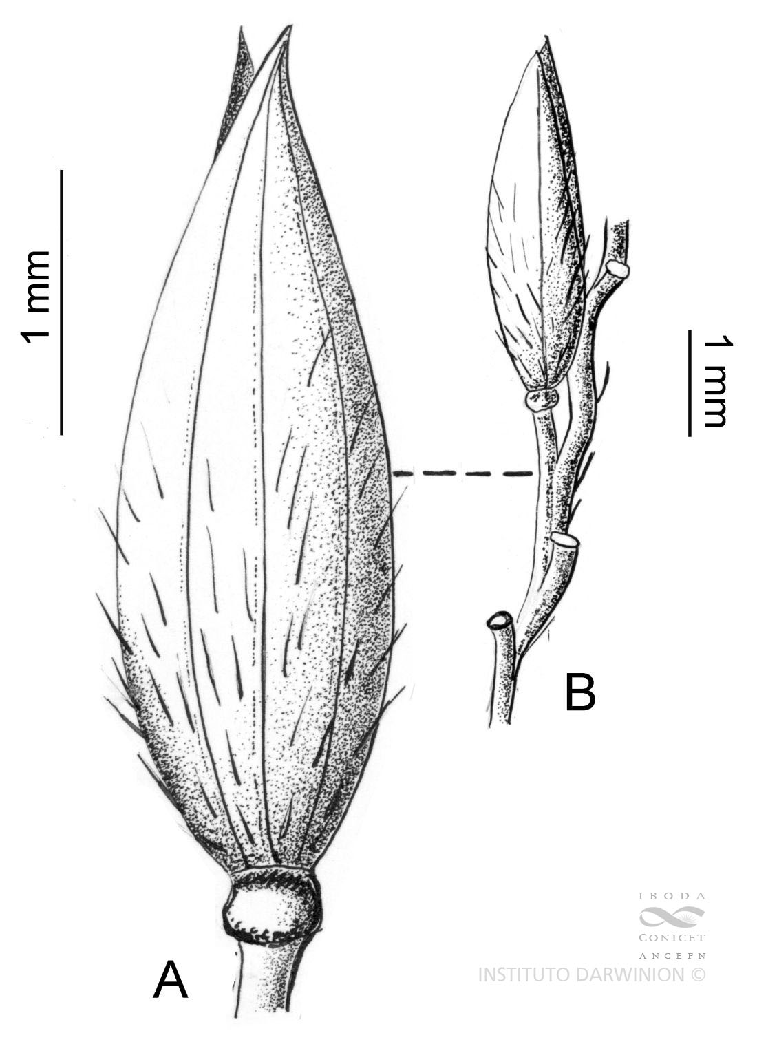 Plantas perennes, de 40-100 cm de alto, cortamente rizomatosas; cañas erectas o geniculadas en la base, con 3-10 entrenudos de 3-18 cm de largo, estriados, glabros; nudos castaños, glabros; vainas de 3-11 cm de largo, generalmente más cortas que los entrenudos, glabras o raro puberulentas, los márgenes membranáceo-ciliolados; lígulas pestañosas de 0,4-1,2 mm de largo; cuello pubescente; láminas lineares a linear-lanceoladas, planas, de 7-40 x 0,4-1 cm, glabras, márgenes escabriúsculos, ápice acuminado. Inflorescencias de 14-45 x 2-5 cm; pedúnculo terete, glabro o esparcidamente piloso; eje principal de 8-20 cm de largo, anguloso, piloso, pelos blanquecinos de hasta 1,5 mm de largo, con 7-22 ramificaciones de primer orden alternas, bilaterales, adpresas al eje o divergentes; raquis de las ramificaciones de 1,5-6 cm x 0,4-0,6 mm, triquetro, piloso, márgenes escabriúsculos; pedicelos de hasta 1,25 mm de largo, escabrosos, de ápice cupuliforme; espiguillas de a pares , una corta y la otra largamente pedicelada, o solitarias hacia el ápice. Espiguillas lanceoladas, de 4-5 x 1-1,2 mm, tempranamente caedizas, articuladas en la base junto al pedicelo; callo cupuliforme de 0,3-0,5 mm de diámetro, violáceo; gluma inferior ausente; gluma superior de 3,8-4,7 mm de largo, pilosa en los ? inferiores, escabriúscula sobre los márgenes hacia la región superior, ápice acuminado, 5-7-nervia; lemma inferior glumiforme, hasta 0,35 mm más corta que la gluma superior, 5-7-nervia; pálea inferior ausente y flor inferior neutra; antecio superior elipsoide, de 2-3,5 x 0,8-1 mm (excluyendo la arista), pajizo, coriáceo, papiloso en toda su superficie; lemma superior aristada en el ápice, arista de 0,8-1,3(-1,5) de largo , recta, con macropelos cortos y rígidos; pálea superior de similar textura que la lemma, de ápice obtuso; anteras de 1,1-1,2 mm de largo; cariopsis elipsoide, castaña; hilo oval-punctiforme; embrión ½ del largo de la cariopsis.