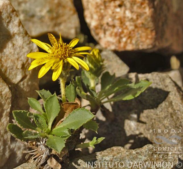 Hierbas perennes rizomatosas, de 5-8 cm de alto. Hojas radicales de 1,5-4 cm de largo, con pecíolos angostos casi tan largos como la lámina, con pelos capitados; láminas elípticoobovadas, espinuloso-dentadas, con pelos capitados y simples, ralos en ambas caras. Capítulos terminales, solitarios, radiados, con pedúnculos cortos, de 1-3,5 cm de largo, lanuginosos, con pelos capitados y pelos simples pluricelulares largos, desnudos o con 1-2 brácteas. Involucro de 1 cm de alto, con filarios dispuestos en 5-6 series, linear-elípticos, de 1 mm de ancho, acuminados, mucronados, lanuginosos, con pelos capitados y pelos simples pluricelulares largos. Flores del margen con corolas liguladas, amarillas, lígula de 10 mm de largo y tubo de 4 mm; las del centro con corolas tubulosas de 7 mm de largo. Aquenios fusiformes, villosos. Papus pajizo, de 6-7 mm de largo.