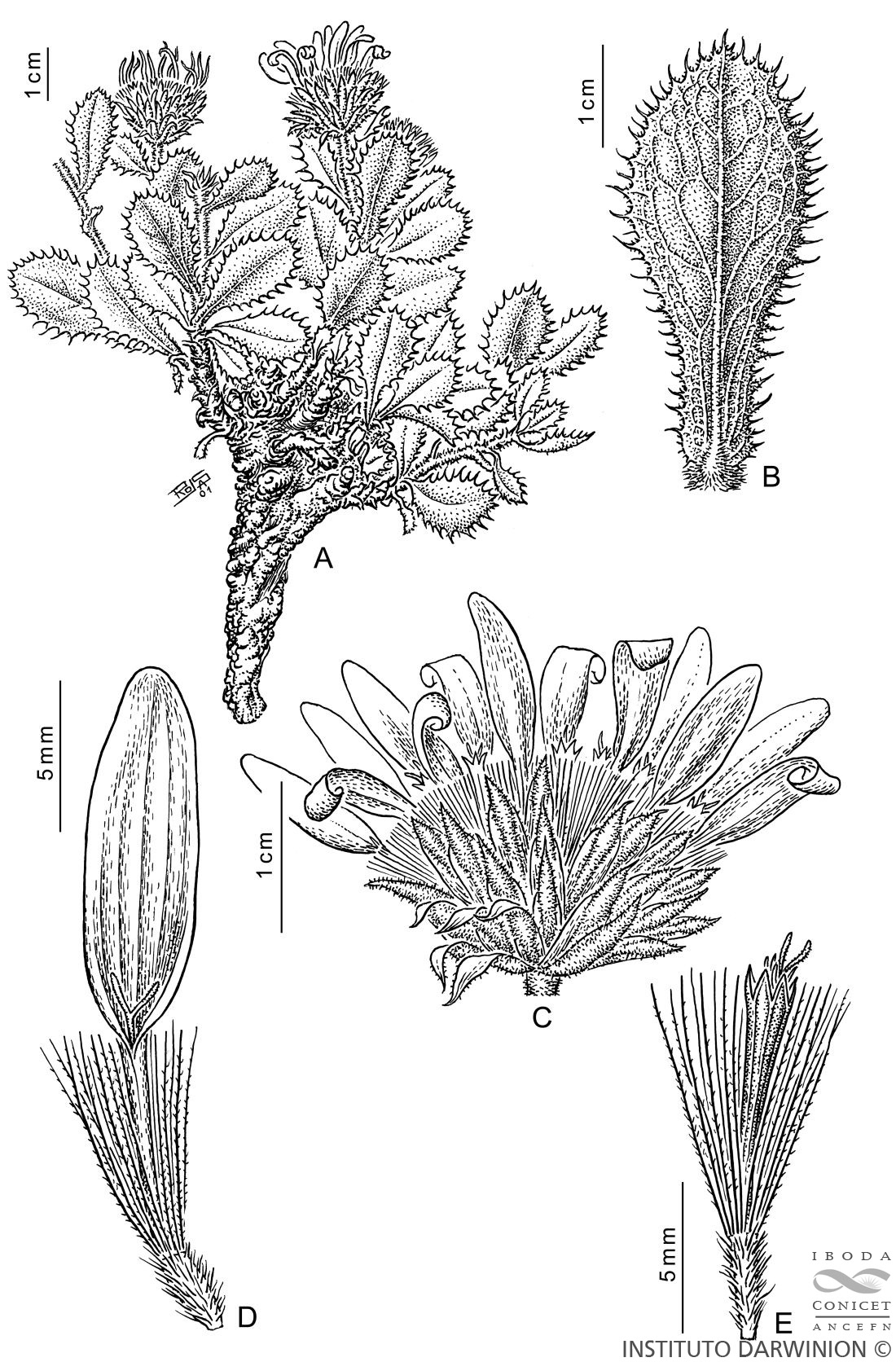 A. Planta. B. Hoja. C. Capítulo. D. Flor del margen. E. Flor del centro. Tomado de Brittonia 54: 52, fig. 2. 2002.