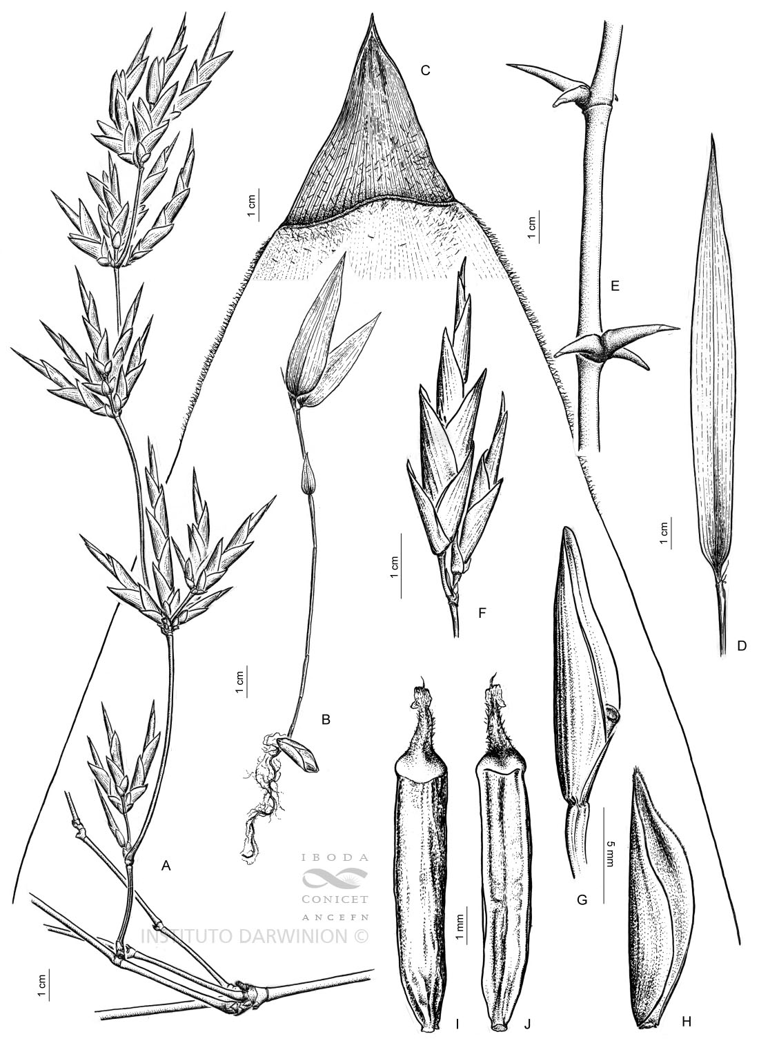 A. Caña florífera. B. Plántula. C. Hoja del culmo. D. Hoja del follaje. E. Fragmento de la caña con espinas caulinares. F. Pseudoespiguillas. G. Antecio. H. Pálea. I. Cariopsis inmadura, vista escutelar. J. Cariopsis inmadura, vista hilar.