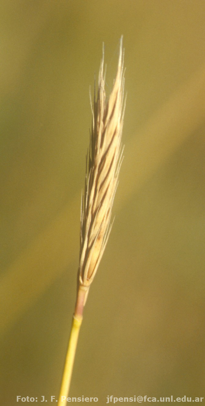 Plantas perennes, por lo general densamente cespitosas, con cañas de (28-)35-120(-150) cm de alto, erectas, rígidas, pluricaules; nudos glabros; lígulas de (0,5)0,8-2(-3) mm de largo, truncadas; láminas de 25-180(-200) x 1,4-7,1 mm, planas, glabras a densamente pilosas; aurículas ausentes. Inflorescencia una espiga de(45-)65-110(-130) x (3-) 4-5 mm, pajizo verdosa; raquis frágil. Espiguilla central sésil; glumas de 4-11 x 0,2-0,5 mm, aplanadas en la base, lanceoladas, escabrosas, erectas; cuerpo de la lemma de 5-9 mm de largo esparcida a densamente pubescente, raro glabro, con 5 nervios poco conspicuos, el ápice aristulado a aristado, arista de (2-)2,5-7(-9) mm de largo; pálea de 6-9 mm de largo, pubescente; lodículas de 1 mm de largo, agudas; anteras de (1,5)2,2-4,4(-5) mm de largo, amarillas; prolongación de la raquilla usualmente ausente, cuando presente hasta de 5,5 mm de largo. Espiguillas laterales rudimentarias, estériles, pedicelos de 1,7-3,2(-3,7) mm de largo; gluma inferior de (4,5-)5-12(-14) x 0,2-0,3 mm, aplanada en la base; gluma superior de (4-)5-12(-14) x 0,2-0,3 mm, setácea a algo aplanada.
