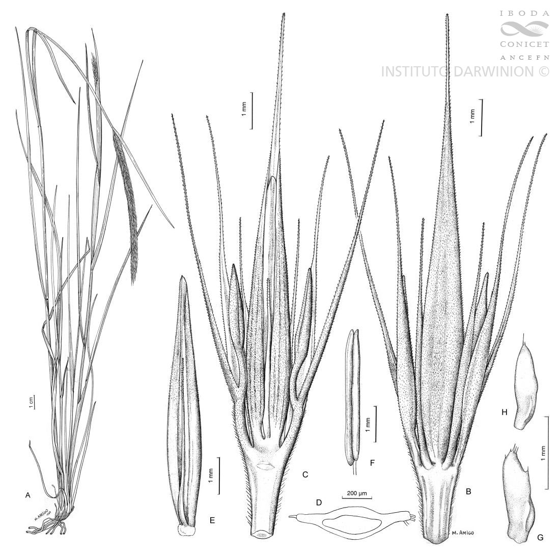 A. Planta. B. Espiguilla, vista dorsal. C. Espiguilla, vista ventral. D. Esquema de corte transversal del artejo. E. Pálea, vista dorsal y raquilla prolongada. F. Estambre. G, H. Lodículas del antecio fértil.