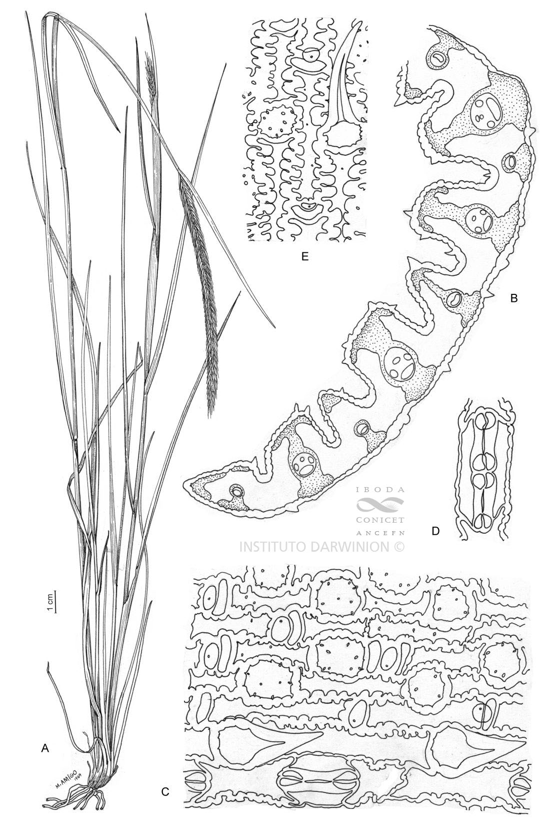 Plantas perennes, por lo general densamente cespitosas, con cañas de (28-)35-120(-150) cm de alto, erectas, rígidas, pluricaules; nudos glabros; lígulas de (0,5)0,8-2(-3) mm de largo, truncadas; láminas de 25-180(-200) x 1,4-7,1 mm, planas, glabras a densamente pilosas; aurículas ausentes. Inflorescencia una espiga de(45-)65-110(-130) x (3-) 4-5 mm, pajizo verdosa; raquis frágil. Espiguilla central sésil; glumas de 4-11 x 0,2-0,5 mm, aplanadas en la base, lanceoladas, escabrosas, erectas; cuerpo de la lemma de 5-9 mm de largo esparcida a densamente pubescente, raro glabro, con 5 nervios poco conspicuos, el ápice aristulado a aristado, arista de (2-)2,5-7(-9) mm de largo; pálea de 6-9 mm de largo, pubescente; lodículas de 1 mm de largo, agudas; anteras de (1,5)2,2-4,4(-5) mm de largo, amarillas; prolongación de la raquilla usualmente ausente, cuando presente hasta de 5,5 mm de largo. Espiguillas laterales rudimentarias, estériles, pedicelos de 1,7-3,2(-3,7) mm de largo; gluma inferior de (4,5-)5-12(-14) x 0,2-0,3 mm, aplanada en la base; gluma superior de (4-)5-12(-14) x 0,2-0,3 mm, setácea a algo aplanada.
