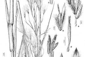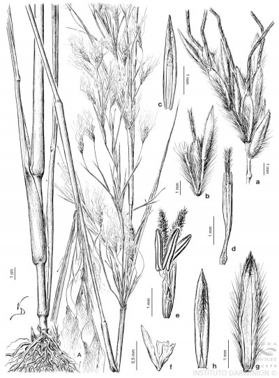 Plantas perennes de 1-2,5 m de alto, cespitosas; cañas erectas, simples, glabras; vainas glabras o hirsutas, menores que los entrenudos; lígulas truncadas, escariosas, de 1-2,5 mm de largo; láminas hasta de 70 x 0,5-1 cm, planas, glabras o hirsutas en la cara adaxial. Inflorescencia hasta de 70 cm de largo, formada por racimos apareados, erectos, bracteados de 1-4 cm de largo, llevando hasta 8 pares de espiguillas sésiles y pediceladas; par basal de espiguillas homomorfas, múticas, de 4,5-5,5 mm de largo; gluma inferior, 9-11-nervia, dorso plano, margen involutos, carinada hacia la parte distal; gluma superior 3-nervia; lemma estéril 1-3-nervia, hialina, ciliada; lemma superior similar, llevando una flor estaminada; lodículas 2; androceo 3, anteras de 2,5-3 mm de largo, amarillentas o rojizas; pares superiores dimorfos, con una espiguilla sésil aristada, de 3,7-4,5 mm de largo; glumas ligeramente cóncavas, pilosas; lemma inferior mútica; lemma superior fértil, con arista geniculada, retorcida en la base, pilosa, delgada y recta hacia el ápice, de 2-3 cm de largo; pálea reducida o ausente; flor perfecta; androceo 3, anteras de 2 mm de largo. Espiguillas pediceladas estériles, o con diminutos estaminodios, múticas, de 3,5-5,5 mm de largo.