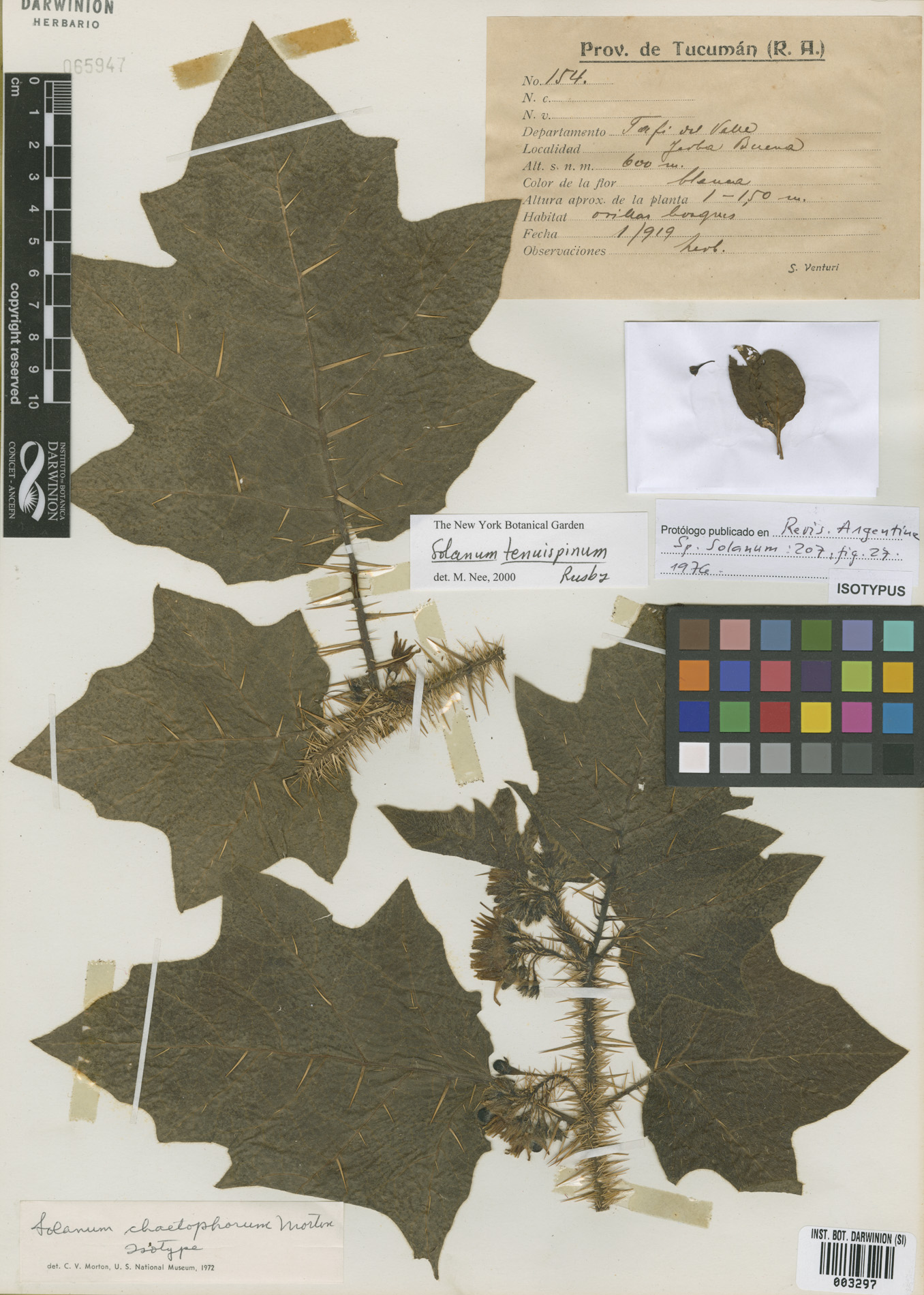 Hierbas hermafroditas hasta de 2 m alto; tallos erectos, poco ramificados, cubiertos de tricomas simples, eglandulares, setiformes, largos (ca. 7 mm) y otros glandulares, y numerosos acúleos aciculares. Pecíolos con acúleos subaciculares; láminas con 3-5 pares de lóbulos agudos y a veces dentados, base cordada o desigual, margen ciliado, ambas caras aculeadas; epifilo con tricomas simples setiformes; hipofilo con tricomas estrellados sésiles con 4 rayos laterales y uno central algo mayor, más algunos tricomas eglandulares simples y otros glandulares. Inflorescencia pedunculada, no ramificada, con (3-)4(-7) flores, todas perfectas. Cáliz piloso, con tricomas setiformes y algunos acúleos, lóbulos angostamente triangulares conectados por una membrana; corola estrellada, hasta de 22 mm de diámetro, blanca, raro violácea; anteras amarillas, ca. 8 mm. Baya ovoide, de 1,4 × 1,2 mm, amarilla a la madurez, pericarpo esponjoso; semillas ca. 80 por fruto, comprimidas, ca. 3 mm, pericarpo con apenas un esbozo de ala.