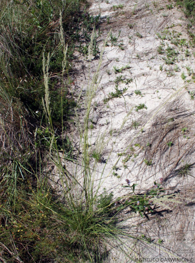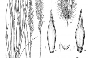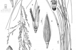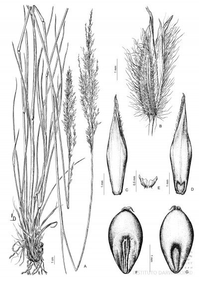 Plantas perennes, cespitosas, la base rodeada por vainas fibrosas, hendidas, cañas de 0,3-1 m de alto, simples; entrenudos de 12-20 cm de largo, comprimidos, huecos, pajizos, glabros; nudos comprimidos, castaños, glabros; vainas de 12-18 cm de largo, glabras a esparcidamente vilosas, los bordes usualmente ciliados hacia la porción distal; lígulas menores de 0,5 mm de largo, membranáceo-ciliadas; láminas lineares, de 11-13(-40) x 0,2-0,3(-0,5) cm, de base redondeada y ápice agudo, planas a comúnmente involutas, glabras a esparcidamente pilosas en la cara adaxial o en ambas caras, densamente pilosas hacia la base en la cara adaxial, los márgenes basales ciliados, con pelos tuberculados caedizos, el resto escabriúsculos. Inflorescencia una panoja contraída de (6-)9-12(-20) x 1,5-3 cm, exerta, con pedúnculos de 10-15 cm de largo, cilíndricos a ligeramente comprimidos, glabros; eje principal estriado, glabro, pulvínulos glabros; ramificaciones de primer orden hasta de 8 cm de largo, ascendentes, alternas, raquis de las ramificaciones glabro, flexuoso, pedicelos claviformes de 1,5-5(-10) mm de largo, flexuosos, glabros. Espiguillas largamente ovoides, de 4-5 mm de largo, híspidas, solitarias, ocasionalmente en pares, gluma superior y lemma inferior subiguales; gluma inferior ausente; gluma superior tan larga como la espiguilla, mútica, aguda, 7-nervia, cubierta por largos pelos blanquecinos, papilosos, más densamente dispuestos hacia los nervios; lemma inferior glumiforme, 7-nervia, con pilosidad similar a la de la gluma superior; pálea y flor inferior ausentes; antecio superior angostamente elipsoide, de 4-4,2 x 1 mm, agudo, membranáceo, liso y pajizo, castaño a la madurez, lemma con los bordes superiores hialinos; flor superior perfecta, lodículas 2, de 0,2 mm de largo, membranáceas, truncadas; estambres 3, anteras de 2,5-3(-3,5) mm de largo, estilos libres; cariopsis obovoide, de 2-2,5 x 1 mm, castaña; hilo elíptico, embrión cerca de ½ del largo de la cariopsis.