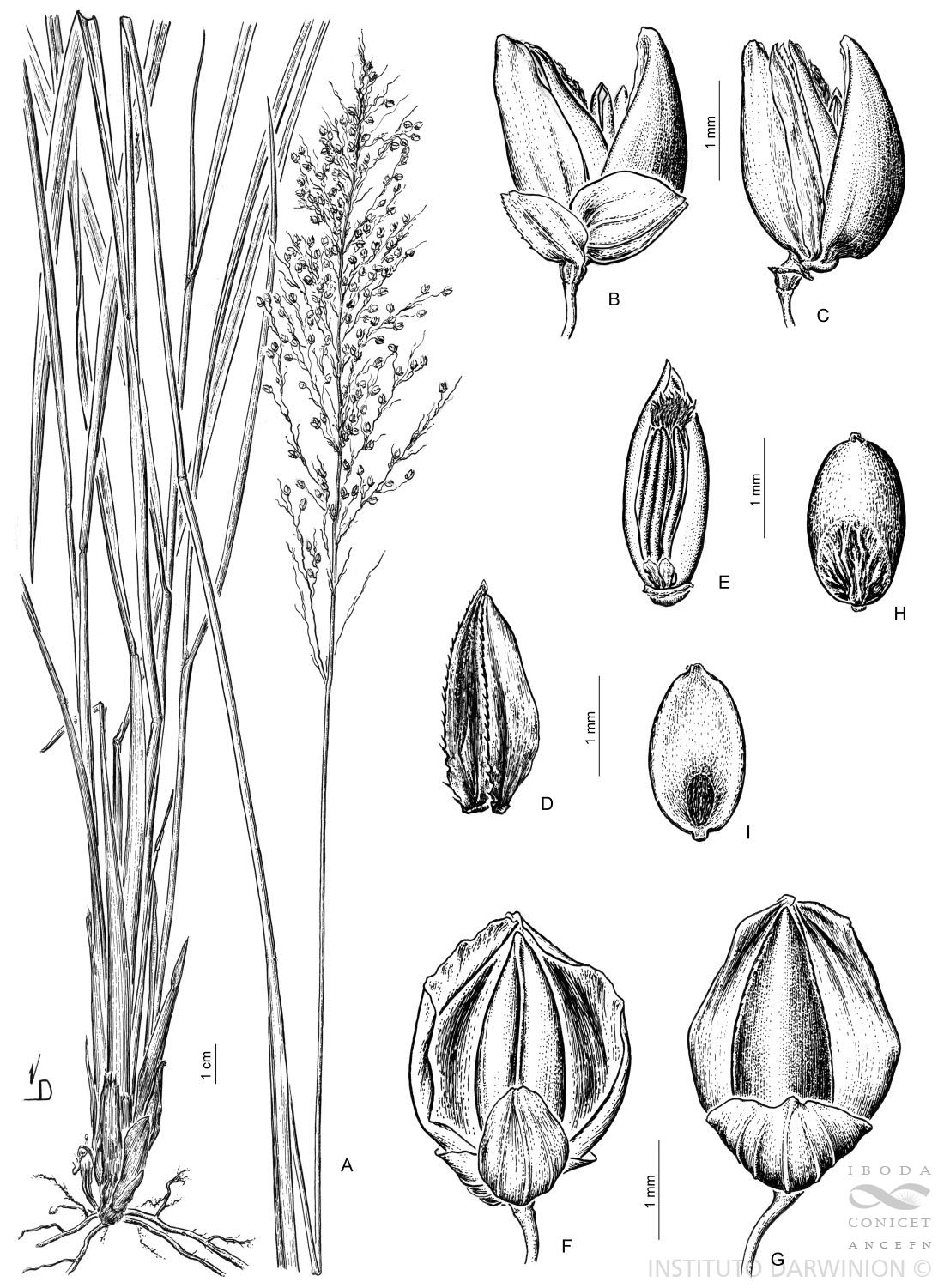 A. Planta. B. Espiguilla vista lateral. C. Antecio inferior y superior, vista lateral. D. Pálea inferior. E. Pálea superior con lodículas, androceo y gineceo. F. Espiguilla madura vista ventral. G. Espiguilla madura vista dorsal. H. Cariopsis vista escutelar. I. Cariopsis vista hilar.