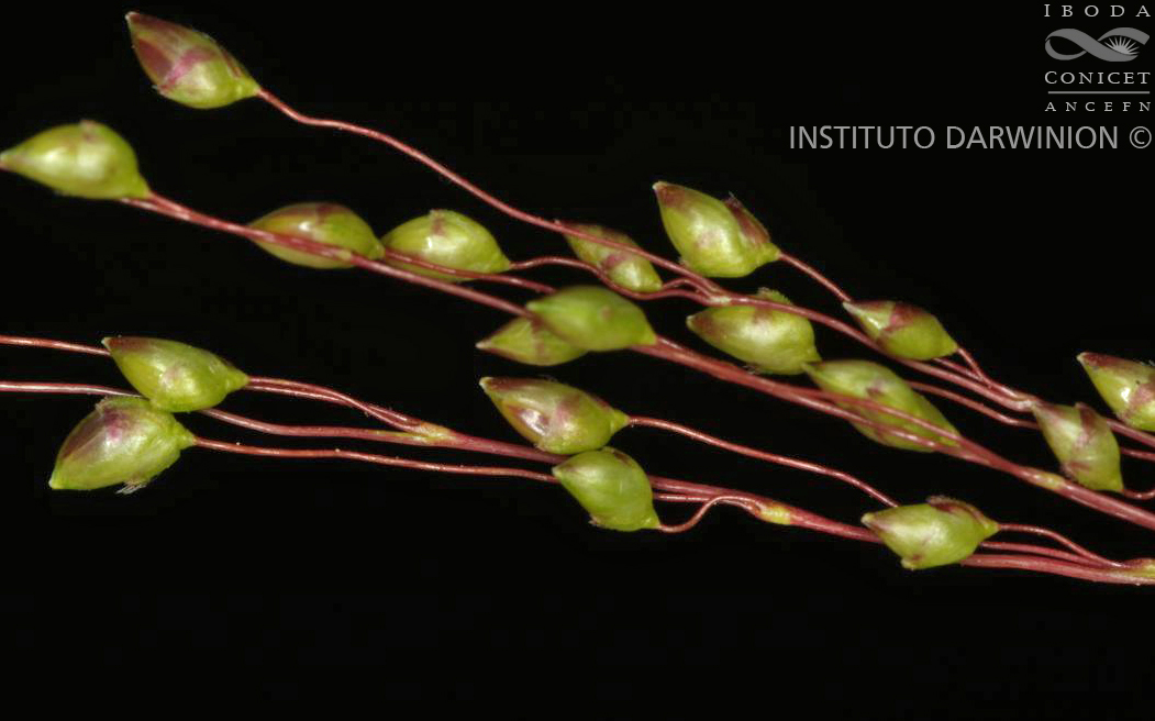 Planta perenne, rizomatosa, con rizomas manifiestos; cañas erectas, simples, de 0,40-1(-1,5) m de alto; entrenudos de 12-27 cm de largo, rígidos, teretes, huecos, glabros; nudos glabros o pilosos, en este caso con pelos blanquecinos adpresos; vainas de 6-28 cm de largo, usualmente más cortas que los entrenudos, glabras a hirsutas, con pelos papilosos, rígidos, lisas a ligeramente escabriúsculas, verdosas a púrpuras, las basales fasciculadas, aquilladas, los márgenes membranáceos, glabros a pestañosos; lígulas 0,6-1,5 mm de largo, membranáceas, de ápice cortamente ciliado, con largos pelos por detrás en la base de la lámina o sin los mismos; láminas lineares, de 6-54 x 0,4-1,5 cm, planas, glabras a esparcidamente pilosas, escabriúsculas, gradualmente atenuadas hacia la base y el ápice, los bordes glabros, escabriúsculos, los inferiores ocasionalmente ciliados. Inflorescencia terminal exerta, pedúnculo hasta de 30 cm de largo, terete, glabro, estriado, panoja laxa, piramidal, multiflora, de 7-28 x 5-15 cm; eje principal anguloso, surcado, glabro a esparcidamente piloso, finamente escabroso, pulvínulos glabros o con escasos pelos, castáneos a purpúreos; ramificaciones de primer orden de 2-9 cm de largo, divergentes, ascendentes, alternas, opuestas o verticiladas, eje de las ramificaciones flexuoso, liso, glabro o con pelos esparcidos, pajizo o con tintes purpúreos, ramificaciones de segundo orden poco divergentes; pedicelos desiguales, el superior 1-2,5 veces más largo que el basal, teretes, glabros, flexuosos, lisos, de ápice cupuliforme. Espiguillas ovoides, de 2,1-3,3 x 1,2-2,5 mm, glabras, glumas subiguales, más cortas que el largo de la espiguilla, membranáceas, pajizas o con tintes purpúreos; gluma inferior anchamente ovada, de 0,8-1,2 mm de largo, subaguda, glabra o pilosa en la porción superior, escabrosa sobre el nervio medio, no abrazadora, 1-3 nervia; gluma superior anchamente ovada, de 0,8-1,1 mm de largo, de ápice truncado y dorso convexo, 5-7 nervia; lemma inferior ovado-lanceolada, de 2,1-3,1 mm de largo, membranácea, navicular, cuando madura coriácea, 3-nervia; pálea inferior membranácea, de 2-3,1 x 1,3-1,4 mm, tan larga como el antecio superior, cuando madura de 2,1-2,5 mm de ancho, 2-nervia, con las quillas escabrosas a cilioladas; flor inferior estaminada, lodículas de 0,5 mm de largo, estambres 3, anteras de 1,3-1,8 mm de largo; antecio superior angostamente elipsoide, de 1,9-2,9 x 1,3-1,9 mm, endurecido, liso, lustroso, castaño oscuro a la madurez, blanquecino junto al ápice; lemma superior gibosa, 5-nervia; pálea superior de dorso plano, 2-nervia; cariopsis ovoide, de 1,5 x 0,7 mm, plano-convexa, pajiza; hilo subbasal, oblongo, embrión ½ del largo de la cariopsis.