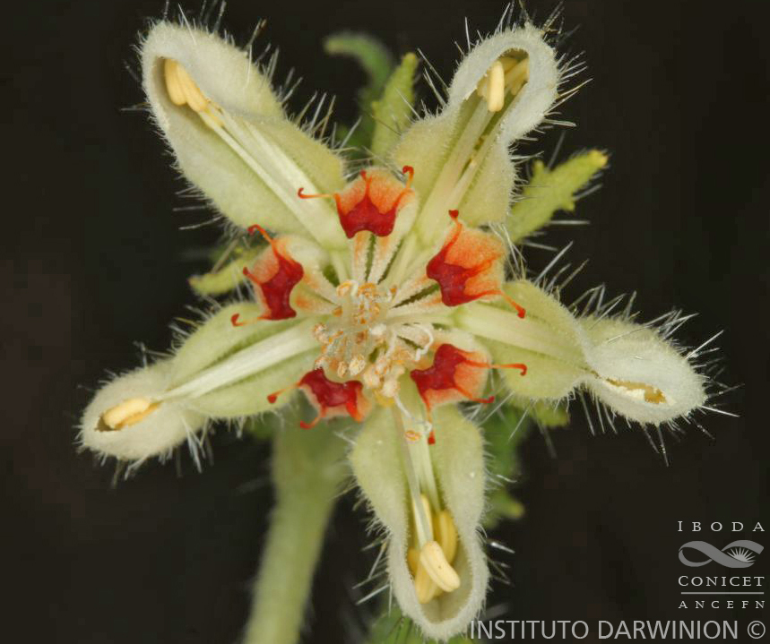 Hierbas volubles, hasta de 0,60 m de alto, urticantes. Tallos densamente cubiertos por pelos gloquidiados, setas cortas retrorsas y setas largas dispersas; corteza amarillenta, exfoliante. Hojas con pecíolos hasta de 5 cm; láminas aovadas, pinnatilobadas, raro pinnatisectas, de 2-12 x 1-7 cm, base truncada, ápice agudo, segmentos aovados a ovado-oblongos, dentados a pinnatífidos, margen revoluto, irregularmente serrado-dentado; haz provisto de pelos cortos, adpresos y setas largas dispersas, con base ensanchada a veces con incrustaciones de carbonato de calcio, envés densamente cubierto de pelos gloquidiados y setas dispersas, principalmente sobre las nervaduras. Inflorescencias laxas, mono o dicasios asimétricos. Flores péndulas, 5-meras. Pedicelos flexibles, ca. 2 cm. Receptáculo obcónico, de 10-12 mm; densamente cubierto de tricomas gloquidiados y setas largas. Cáliz expandido a deflexo; sépalos angostamente lanceolados, enteros a pinnatipartidos, de 5-7 mm; setosos en el margen. Corola expandida, estrellada; pétalos cóncavos, clocleariformes, más o menos alados, cuculados o de ápice agudo, de 10-15 x 5-9 mm; exteriormente setosos; color blanco o amarillo claro. Escamas nectaríferas cimbiformes, muy cóncavas, de 4,5-7 x 2-3 mm, cara dorsal quillada; color anaranjado claro, glabras; ápice engrosado, diferenciado, púrpura, prolongado en dos engrosamientos subapicales en forma de arco y dos aurículas laterales del mismo color; cuello anguloso o redondeado; apéndices dorsales 3, insertos aproximadamente en la ½ de la longitud de la escama, laminares, angostamente espatulados a filiformes, de 1,5-3 mm, papilosos, color anaranjado claro con el ápice rojizo. Estaminodios de 5-8 mm; blancos; densamente papilosos; lengüeta basal ciliada. Cápsula péndula, angostamente oblonga, espiralada, hasta de 50 x 10 mm, setosa.