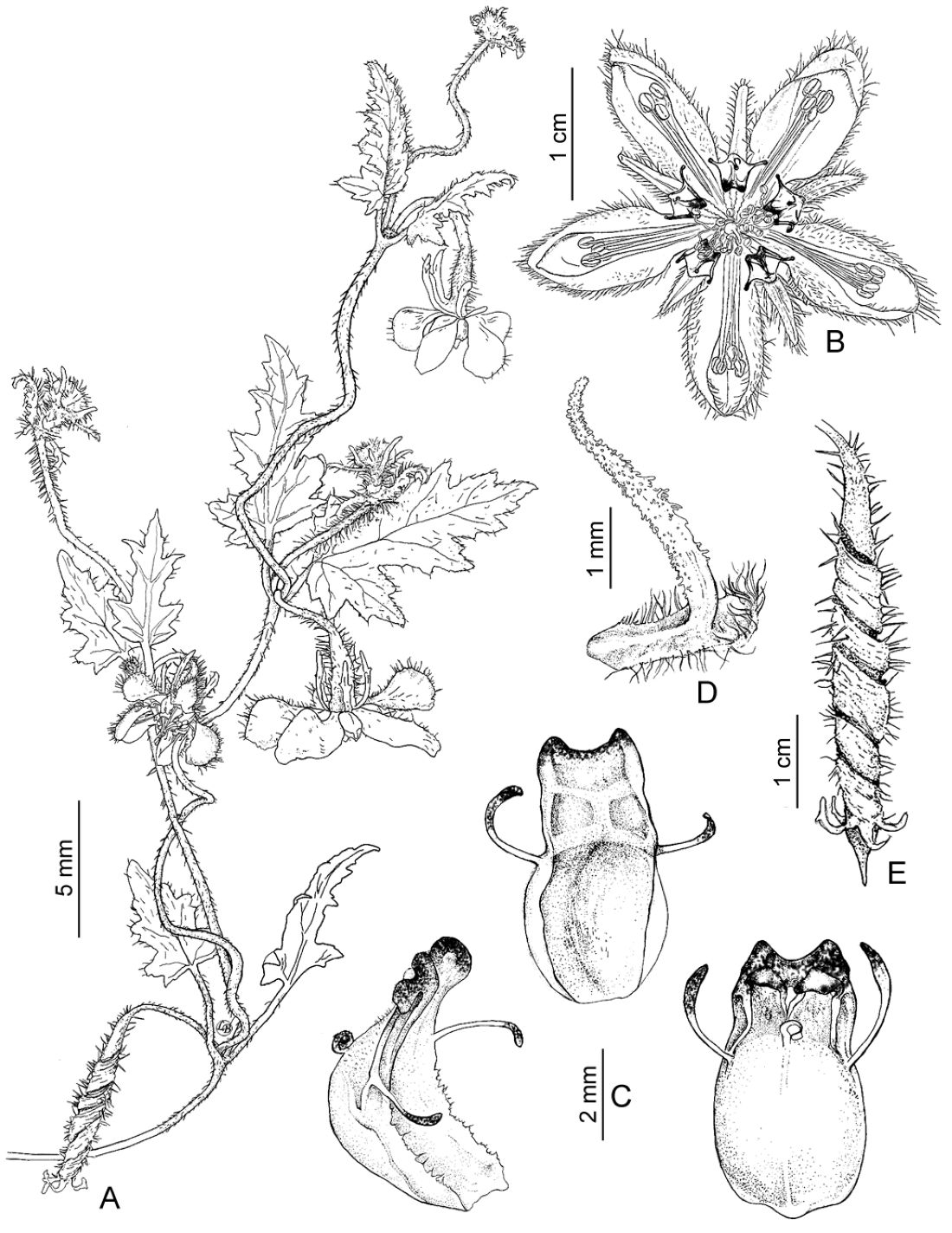Hierbas volubles, hasta de 0,60 m de alto, urticantes. Tallos densamente cubiertos por pelos gloquidiados, setas cortas retrorsas y setas largas dispersas; corteza amarillenta, exfoliante. Hojas con pecíolos hasta de 5 cm; láminas aovadas, pinnatilobadas, raro pinnatisectas, de 2-12 x 1-7 cm, base truncada, ápice agudo, segmentos aovados a ovado-oblongos, dentados a pinnatífidos, margen revoluto, irregularmente serrado-dentado; haz provisto de pelos cortos, adpresos y setas largas dispersas, con base ensanchada a veces con incrustaciones de carbonato de calcio, envés densamente cubierto de pelos gloquidiados y setas dispersas, principalmente sobre las nervaduras. Inflorescencias laxas, mono o dicasios asimétricos. Flores péndulas, 5-meras. Pedicelos flexibles, ca. 2 cm. Receptáculo obcónico, de 10-12 mm; densamente cubierto de tricomas gloquidiados y setas largas. Cáliz expandido a deflexo; sépalos angostamente lanceolados, enteros a pinnatipartidos, de 5-7 mm; setosos en el margen. Corola expandida, estrellada; pétalos cóncavos, clocleariformes, más o menos alados, cuculados o de ápice agudo, de 10-15 x 5-9 mm; exteriormente setosos; color blanco o amarillo claro. Escamas nectaríferas cimbiformes, muy cóncavas, de 4,5-7 x 2-3 mm, cara dorsal quillada; color anaranjado claro, glabras; ápice engrosado, diferenciado, púrpura, prolongado en dos engrosamientos subapicales en forma de arco y dos aurículas laterales del mismo color; cuello anguloso o redondeado; apéndices dorsales 3, insertos aproximadamente en la ½ de la longitud de la escama, laminares, angostamente espatulados a filiformes, de 1,5-3 mm, papilosos, color anaranjado claro con el ápice rojizo. Estaminodios de 5-8 mm; blancos; densamente papilosos; lengüeta basal ciliada. Cápsula péndula, angostamente oblonga, espiralada, hasta de 50 x 10 mm, setosa.