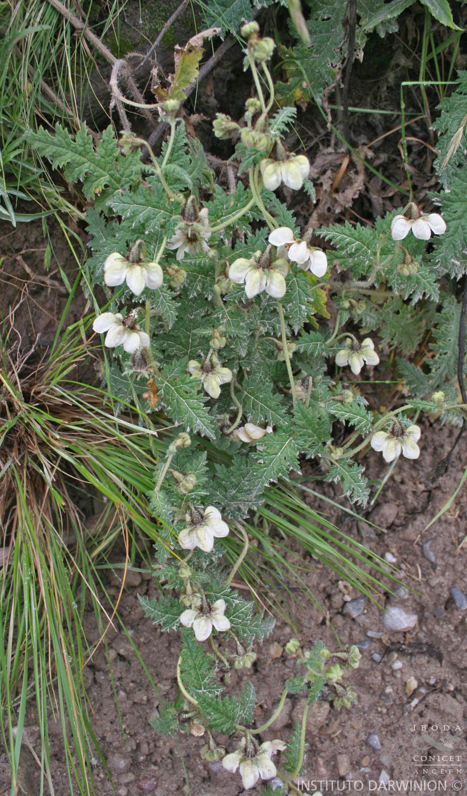 Hierbas volubles a veces decumbentes, brevemente rizomatosas o no, hasta de 1,5 m de alto, urticantes. Tallos densamente cubiertos de setas largas y cortas antrorsas, pelos gloquidiados cortos y escábridos escasos; corteza amarillenta. Hojas con pecíolos hasta de 3 cm; láminas ovadas a anchamente ovadas, pinnatisectas a bipinnatisectas, hasta de 9 x 5 cm, base truncada a deltoide, ápice agudo, segmentos basales ovados a anchamente ovados, los superiores ovado-triangulares hasta triangulares, margen profunda e irregularmente aserrado, frecuentemente con una glándula en cada diente, a veces revoluto; haz cubierto por setas largas y con setas cortas en las proximidades de las nervaduras, pelos gloquidiados y escábridos principalmente sobre nervaduras y margen, envés con abundantes setas cortas y sobre las nervaduras setas largas, pelos gloquidiados y escábridos. Inflorescencias laxas, mono más ramente dicasios asimétricos. Flores nutantes, 5-meras. Pedicelos rígidos, de 2,5-4 cm. Receptáculo obcónico, de 5-6 mm; densamente cubierto de pelos gloquidiados y setas dispersas. Cáliz deflexo; sépalos oblongos a oblongo-lanceolados, pinnatisectos, de 6-7 x 3-3,5 mm; pubescencia similar a la del receptáculo. Corola cortamente acampanada; pétalos obovados, profundamente cimbiformes, ápice obtuso a veces subcuculado, anchamente alados hacia la base, de 16-17 x 11-12 mm, 3-4 mm de profundidad; exteriormente cubierto de pelos gloquidiados y setas dispersas, interiormente glabros, blancos. Escamas nectaríferas profundamente cimbiformes, dorsalmente ovada-oblongas, de 5,5-6 x 3-3,5 mm, cara dorsal 3-nervada; blancas; exteriormente algo escabrosas, interiormente glabras; ápice engrosado, diferenciado, rojo que se continúa en dos engrosamientos dorsales en forma de arco y del mismo color; cuello obtuso, hendido, redondeado; apéndices dorsales 3, subapicales, espatulados, ca. 2-2,2 mm, blancos con el ápice laminar de color rojo. Estaminodios ca. 8 mm; blancos; ápice densamente papiloso; lengüeta basal membranácea, pilosa. Cápsula deflexa, obcónica a claviforme, 10-nervada, espiralada, de 20-23 x 10-12 mm en la parte superior, glabrescente.