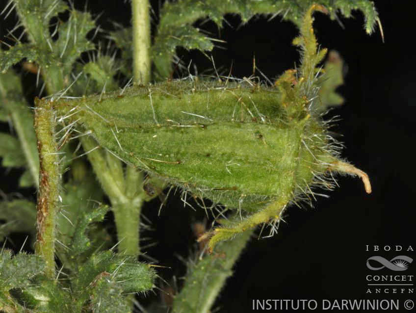 Hierbas volubles a veces decumbentes, de aprox. 0,50 m de alto, urticantes. Tallos cubiertos de setas largas y cortas, antrorsas, pelos cortos gloquidiados y escábridos; corteza amarillenta. Hojas con pecíolo hasta de 6 cm; lámina ovado-lanceolada, pinnatisecta a bipinnatisecta, hasta de 11 x 5,5 cm, base generalmente truncada, ápice agudo; segmentos ovado-triangulares, los basales a menudo libres, agudos; margen irregularmente dentado, dientes menores intercalados entre otros mayores; haz laxamente cubierto por setas largas antrorsas y pelos cortos gloquidiados y escábridos, envés provisto de pelos gloquidiados y setas largas. Inflorescencias laxas, monocasios o dicasios asimétricos. Flores horizontales a deflexas, 5-meras. Pedicelos rígidos, hasta de 21 cm. Receptáculo obcónico, de 5-6 mm; densamente cubierto de pelos cortos gloquidiados y setas largas dispersas. Cáliz deflexo; sépalos lanceolados a ovado-lanceolados, pinnatisectos, de 4-5 x 2 mm; pubescencia similar a la del receptáculo. Corola cortamente acampanada; pétalos obovados, profundamente cimbiformes, alados hacia la base, de 10-12 x 7-8 mm, 3-4 mm de profundidad, alas minuta e irregularmente lobuladas; exteriormente cubiertos de pelos gloquidiados y setas dispersas, interiormente glabros; amarillos, más raramente blanco amarillento. Escamas nectaríferas cimbiformes, semilunares en vista lateral, dorsalmente oblongas, 3-costadas, ca. 4 x 2 mm; color amarillo o amarillo verdoso; exteriormente pilosas, interior glabrescente; ápice emarginado, ligeramente engrosado, no diferenciado; cuello subrectangular; apéndices dorsales generalmente 2 desarrollados y el central reducido o ausente, insertos en el 1/3 superior de la escama, espatulados, ca. 2,5 mm, amarillentos o blanquecinos. Estaminadios de 6-7 mm; blanco-amarillentos; densamente papilosos; lengüeta basal oblonga, membranácea, pilosa. Cápsula deflexa, brevemente obcónica a claviforme, recta, de 20-25 x 10 mm en la parte superior, glabrescente.