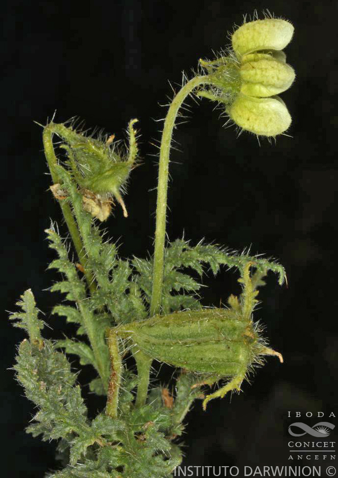 Hierbas volubles a veces decumbentes, de aprox. 0,50 m de alto, urticantes. Tallos cubiertos de setas largas y cortas, antrorsas, pelos cortos gloquidiados y escábridos; corteza amarillenta. Hojas con pecíolo hasta de 6 cm; lámina ovado-lanceolada, pinnatisecta a bipinnatisecta, hasta de 11 x 5,5 cm, base generalmente truncada, ápice agudo; segmentos ovado-triangulares, los basales a menudo libres, agudos; margen irregularmente dentado, dientes menores intercalados entre otros mayores; haz laxamente cubierto por setas largas antrorsas y pelos cortos gloquidiados y escábridos, envés provisto de pelos gloquidiados y setas largas. Inflorescencias laxas, monocasios o dicasios asimétricos. Flores horizontales a deflexas, 5-meras. Pedicelos rígidos, hasta de 21 cm. Receptáculo obcónico, de 5-6 mm; densamente cubierto de pelos cortos gloquidiados y setas largas dispersas. Cáliz deflexo; sépalos lanceolados a ovado-lanceolados, pinnatisectos, de 4-5 x 2 mm; pubescencia similar a la del receptáculo. Corola cortamente acampanada; pétalos obovados, profundamente cimbiformes, alados hacia la base, de 10-12 x 7-8 mm, 3-4 mm de profundidad, alas minuta e irregularmente lobuladas; exteriormente cubiertos de pelos gloquidiados y setas dispersas, interiormente glabros; amarillos, más raramente blanco amarillento. Escamas nectaríferas cimbiformes, semilunares en vista lateral, dorsalmente oblongas, 3-costadas, ca. 4 x 2 mm; color amarillo o amarillo verdoso; exteriormente pilosas, interior glabrescente; ápice emarginado, ligeramente engrosado, no diferenciado; cuello subrectangular; apéndices dorsales generalmente 2 desarrollados y el central reducido o ausente, insertos en el 1/3 superior de la escama, espatulados, ca. 2,5 mm, amarillentos o blanquecinos. Estaminadios de 6-7 mm; blanco-amarillentos; densamente papilosos; lengüeta basal oblonga, membranácea, pilosa. Cápsula deflexa, brevemente obcónica a claviforme, recta, de 20-25 x 10 mm en la parte superior, glabrescente.