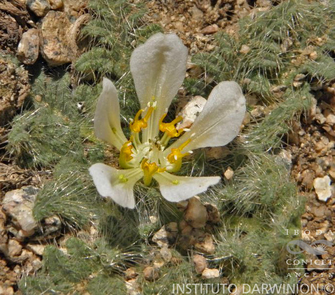 Hierbas arrosetadas, inermes o poco urticantes. Tallos constituidos por una porción aérea de 1-3 cm y una parte subterránea conformada por un eje vertical de 4-5 cm y un sistema de rizomas, de 5-15 cm, 0,2- 0,4 cm de diám., provistos de catáfilas opuestas y entrenudos de 2-8 cm. Hojas con pecíolos aplanados de 1-3 cm; lámina angostamente ovada a triangular-ovada, pinnatilobada a pinnatisecta, generalmente la porción superior lobada y la inferior sectada, hasta de 8 x 2 cm; base truncada, ápice obtuso, segmentos 3-4 lobados con ápice obtuso, los proximales ocasionalmente libres, margen revoluto; haz provisto de abundantes tricomas gloquidiados y setas largas dispersas, envés densamente cubierto por tricomas gloquidiados. Inflorescencias con los entrenudos condensados, monocasios. Flores erectas, subsésiles, 1-2 en la axila de las hojas superiores, 5-meras. Pedicelo grueso y breve. Receptáculo obcónico, de 4-5 mm; provisto de abundantes tricomas gloquidiados. Cáliz algo deflexo; sépalos enteros, linear - triangulares, obtusos, de 3-6 mm; cubiertos de tricomas gloquidiados. Corola levemente expandida, de 20-40 mm de diám.; pétalos obovados, oblanceolados o espatulados, levemente cocleariformes a planos, obtusos, quillados dorsalmente, de 13-18 x 7 mm; haz densamente provisto de tricomas escábridos y gloquidiados y abundantes setas largas sobre las 3 nervaduras principales, envés con pelos gloquidiados; blancos. Escamas nectaríferas cimbiformes, semilunares en vista lateral, 3-nervadas, ca. 3-3,5 x 1-1,5 mm, amarillentas; dorsal y ventralmente provistas de pelos gloquidiados, margen ciliado; ápice engrosado amarillo o anaranjado que se prolonga en dos aurículas laterales y dos arcos dorsales situados entre las nervaduras; cuello emarginado; apéndices dorsales 3, subapicales, filiformes, aplanados, de 2,5-3 mm, anaranjados con el extremo dilatado y aguzado de color blanco, luego castaño en la antesis. Estaminodios de 5-6 mm, densamente papilosos, blancos; lengüeta basal pilosa. Cápsula subsésil, obovoide, recta, de 10-15 x 8-10 mm, provista abundantes pelos gloquidiados.