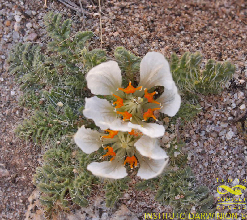 Hierbas arrosetadas, inermes o poco urticantes. Tallos constituidos por una porción aérea de 1-3 cm y una parte subterránea conformada por un eje vertical de 4-5 cm y un sistema de rizomas, de 5-15 cm, 0,2- 0,4 cm de diám., provistos de catáfilas opuestas y entrenudos de 2-8 cm. Hojas con pecíolos aplanados de 1-3 cm; lámina angostamente ovada a triangular-ovada, pinnatilobada a pinnatisecta, generalmente la porción superior lobada y la inferior sectada, hasta de 8 x 2 cm; base truncada, ápice obtuso, segmentos 3-4 lobados con ápice obtuso, los proximales ocasionalmente libres, margen revoluto; haz provisto de abundantes tricomas gloquidiados y setas largas dispersas, envés densamente cubierto por tricomas gloquidiados. Inflorescencias con los entrenudos condensados, monocasios. Flores erectas, subsésiles, 1-2 en la axila de las hojas superiores, 5-meras. Pedicelo grueso y breve. Receptáculo obcónico, de 4-5 mm; provisto de abundantes tricomas gloquidiados. Cáliz algo deflexo; sépalos enteros, linear - triangulares, obtusos, de 3-6 mm; cubiertos de tricomas gloquidiados. Corola levemente expandida, de 20-40 mm de diám.; pétalos obovados, oblanceolados o espatulados, levemente cocleariformes a planos, obtusos, quillados dorsalmente, de 13-18 x 7 mm; haz densamente provisto de tricomas escábridos y gloquidiados y abundantes setas largas sobre las 3 nervaduras principales, envés con pelos gloquidiados; blancos. Escamas nectaríferas cimbiformes, semilunares en vista lateral, 3-nervadas, ca. 3-3,5 x 1-1,5 mm, amarillentas; dorsal y ventralmente provistas de pelos gloquidiados, margen ciliado; ápice engrosado amarillo o anaranjado que se prolonga en dos aurículas laterales y dos arcos dorsales situados entre las nervaduras; cuello emarginado; apéndices dorsales 3, subapicales, filiformes, aplanados, de 2,5-3 mm, anaranjados con el extremo dilatado y aguzado de color blanco, luego castaño en la antesis. Estaminodios de 5-6 mm, densamente papilosos, blancos; lengüeta basal pilosa. Cápsula subsésil, obovoide, recta, de 10-15 x 8-10 mm, provista abundantes pelos gloquidiados.