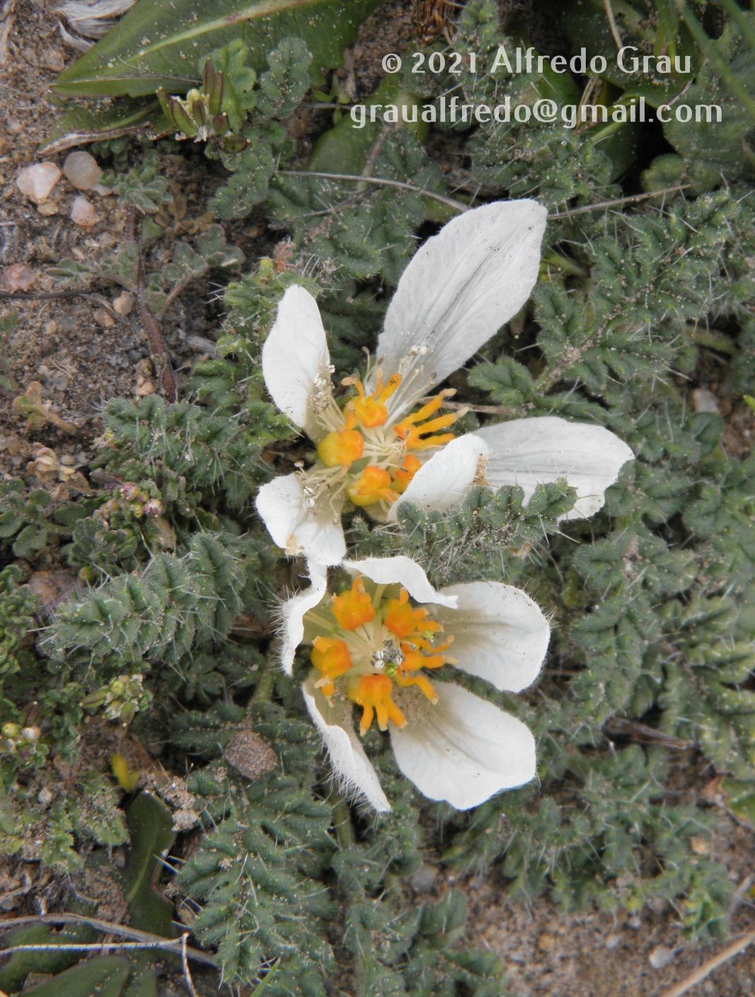 Hierbas arrosetadas, inermes o poco urticantes. Tallos constituidos por una porción aérea de 1-3 cm y una parte subterránea conformada por un eje vertical de 4-5 cm y un sistema de rizomas, de 5-15 cm, 0,2- 0,4 cm de diám., provistos de catáfilas opuestas y entrenudos de 2-8 cm. Hojas con pecíolos aplanados de 1-3 cm; lámina angostamente ovada a triangular-ovada, pinnatilobada a pinnatisecta, generalmente la porción superior lobada y la inferior sectada, hasta de 8 x 2 cm; base truncada, ápice obtuso, segmentos 3-4 lobados con ápice obtuso, los proximales ocasionalmente libres, margen revoluto; haz provisto de abundantes tricomas gloquidiados y setas largas dispersas, envés densamente cubierto por tricomas gloquidiados. Inflorescencias con los entrenudos condensados, monocasios. Flores erectas, subsésiles, 1-2 en la axila de las hojas superiores, 5-meras. Pedicelo grueso y breve. Receptáculo obcónico, de 4-5 mm; provisto de abundantes tricomas gloquidiados. Cáliz algo deflexo; sépalos enteros, linear - triangulares, obtusos, de 3-6 mm; cubiertos de tricomas gloquidiados. Corola levemente expandida, de 20-40 mm de diám.; pétalos obovados, oblanceolados o espatulados, levemente cocleariformes a planos, obtusos, quillados dorsalmente, de 13-18 x 7 mm; haz densamente provisto de tricomas escábridos y gloquidiados y abundantes setas largas sobre las 3 nervaduras principales, envés con pelos gloquidiados; blancos. Escamas nectaríferas cimbiformes, semilunares en vista lateral, 3-nervadas, ca. 3-3,5 x 1-1,5 mm, amarillentas; dorsal y ventralmente provistas de pelos gloquidiados, margen ciliado; ápice engrosado amarillo o anaranjado que se prolonga en dos aurículas laterales y dos arcos dorsales situados entre las nervaduras; cuello emarginado; apéndices dorsales 3, subapicales, filiformes, aplanados, de 2,5-3 mm, anaranjados con el extremo dilatado y aguzado de color blanco, luego castaño en la antesis. Estaminodios de 5-6 mm, densamente papilosos, blancos; lengüeta basal pilosa. Cápsula subsésil, obovoide, recta, de 10-15 x 8-10 mm, provista abundantes pelos gloquidiados.