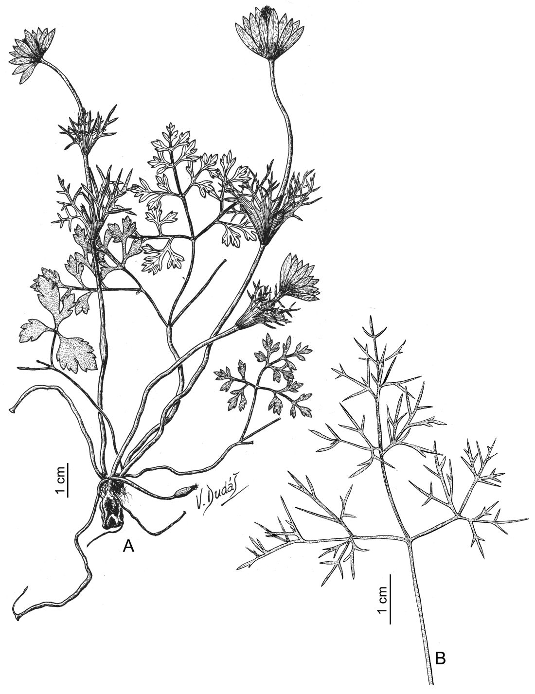 A. Planta. B. Lámina foliar con segmentos profundamente partidos.