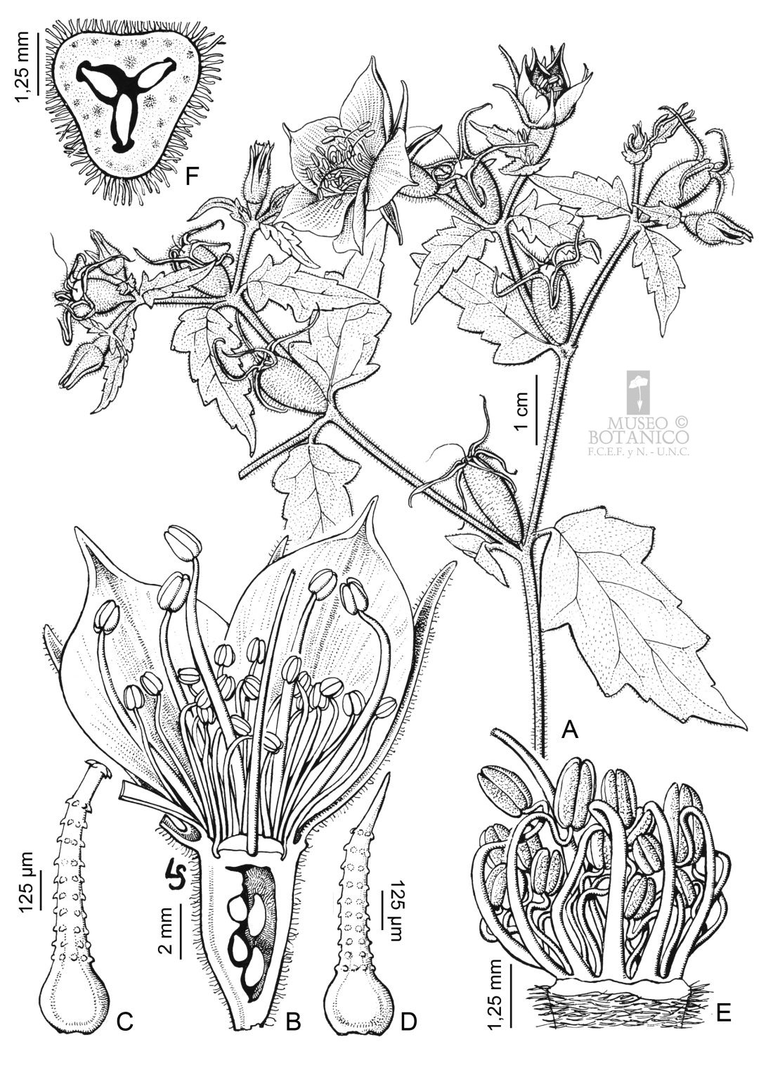 A. Rama con flores y frutos. B. Flor, corte longitudinal. C. Tricoma gloquidiado. D. Tricoma. E. Androceo y gineceo. F. Ovario, corte transversal.