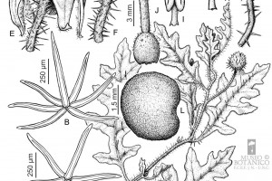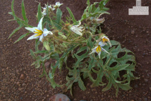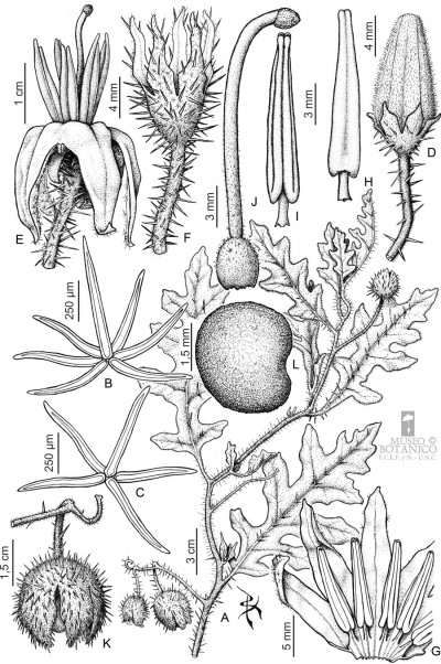 Hierbas perennes, andromonoicas, hasta de 60 cm de alto, con raíces gemíferas; tallos ramificados desde la base, cubiertos por tricomas estrellados corta a largamente estipitados, con acúleos aciculares esparcidos o abundantes, con formas de transición entre tricomas estrellados y acúleos (acúleos jóvenes con varios rayos ascendentes en su ápice), y con tricomas eglandulares y glandulares. Hojas pecioladas; láminas desde enteras y ovadas hasta largamente elípticas, base cuneada, frecuentemente repando-lobadas, a veces liradas o pinnatífidas, con 3-5 pares de lóbulos redondeados; epifilo con tricomas estrellados sésiles con 4-6-8 rayos laterales y un rayo central igual o algo menor; hipofilo con indumento similar; ambas caras con algunos acúleos aciculares esparcidos. Inflorescencia pedunculada, no ramificada, con 1(-3) flores perfectas y (1-)3(-5) flores estaminadas. Cáliz con lóbulos triangulares agudos y tubo aculeado; corola semi-estrellada, blanca, ca. 4 cm de diámetro, lóbulos reflexos; anteras amarillas, iguales, de 10-11 mm. Baya globosa, ca. 2 cm de diámetro, amarillo-anaranjada, cubierta casi completamente por el tubo calicinal acrescente y armado; semillas lenticulares, de 3 mm, castañas, lisas